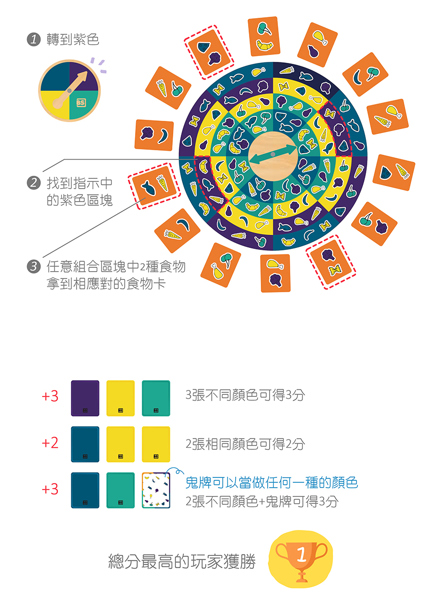 內容物:顏色轉盤×1、食物轉盤×1、食物卡×45