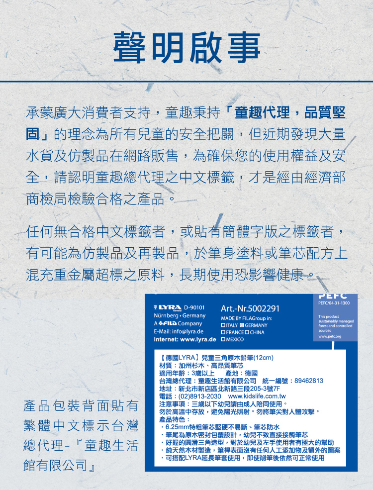 LYRA所有產品均通過歐洲所有安全性檢測以及醫學測試,LYRA的鉛筆及色鉛筆,顯色度佳,堅固不易斷,提供高品質、安全、環保的產品。有了這樣的承諾,世界各地的父母們都以選用安全和物超所值的產品。