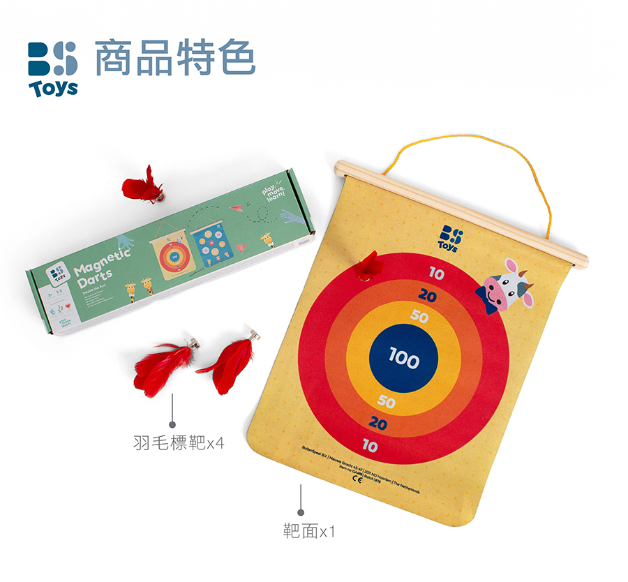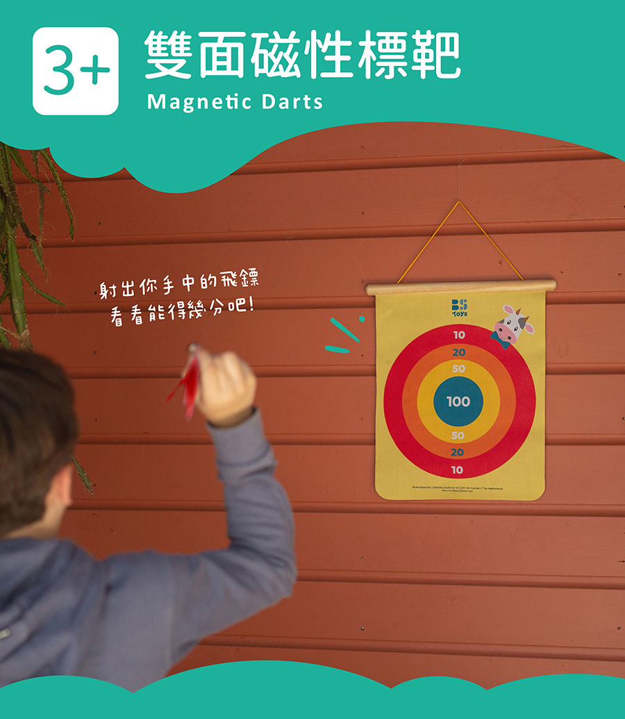 歡樂動物園中,牛牛和長頸鹿寶寶們迫不及待邀請你一起玩樂,快射出你手中的飛鏢吧!雙面情境靶面,不同的得分位置,趣味加倍,安全平頭磁性飛鏢,不傷手玩得安心,是款適合全家大小一起玩樂的標靶遊戲。