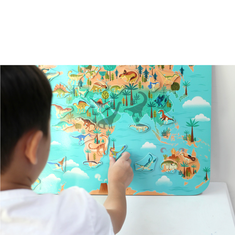 透過世界地圖發現恐龍們的棲息地,並跟著牠們的足跡,開始環遊世界!