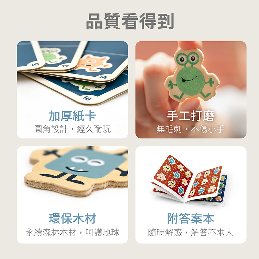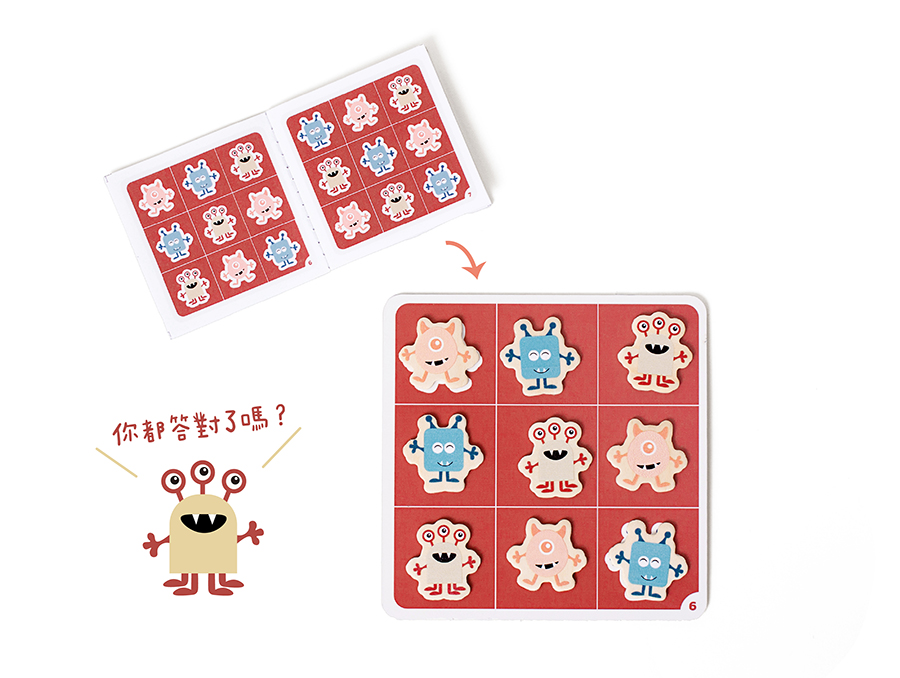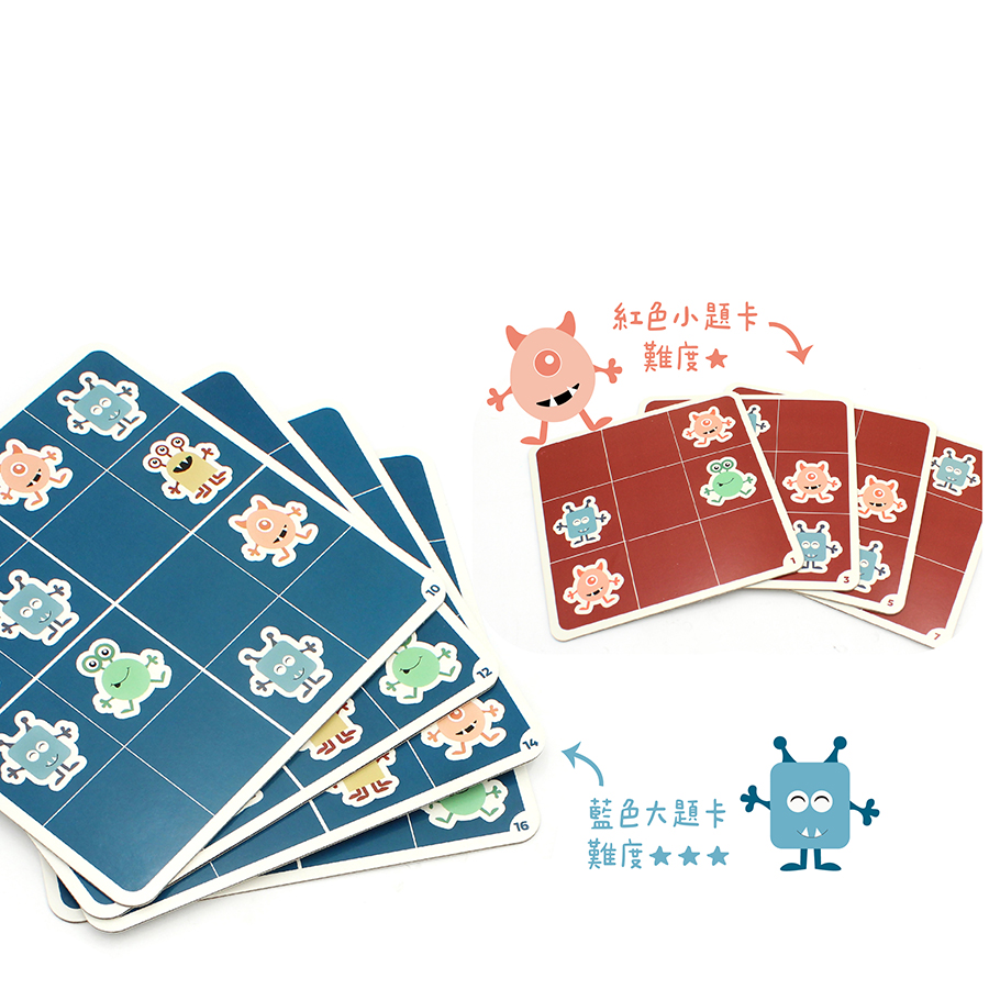 內容物:小怪獸×16、雙面題卡×8、答案本×1