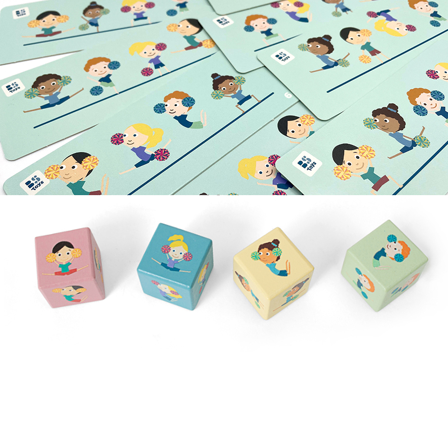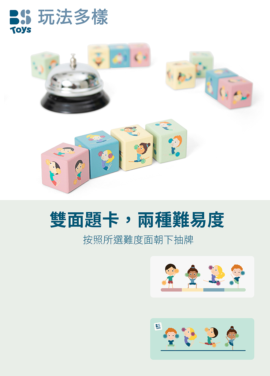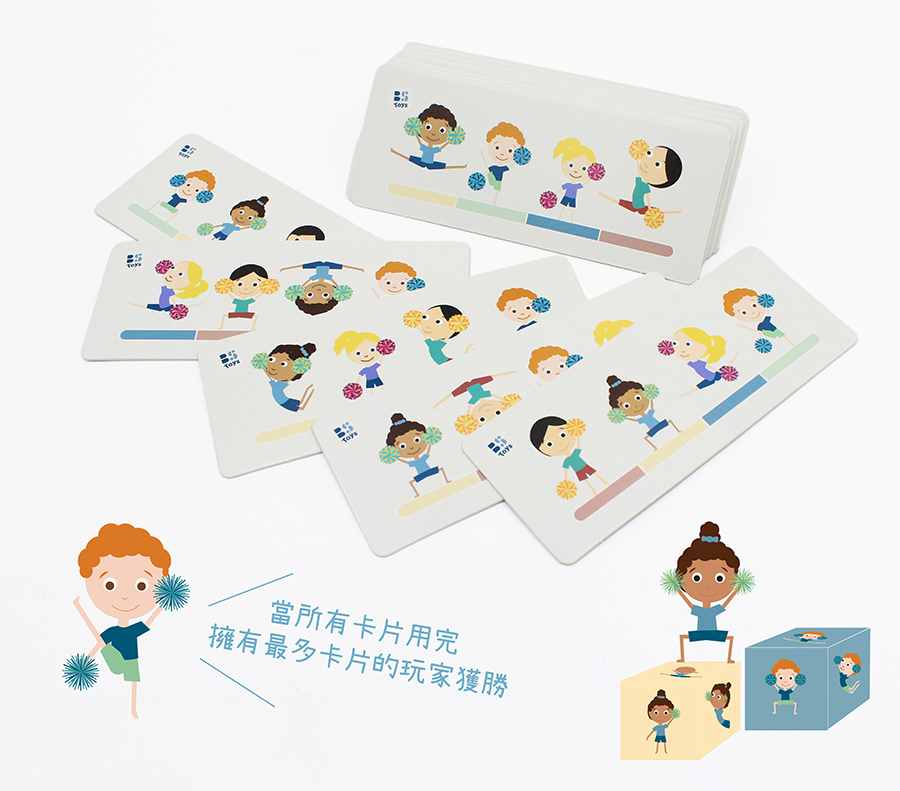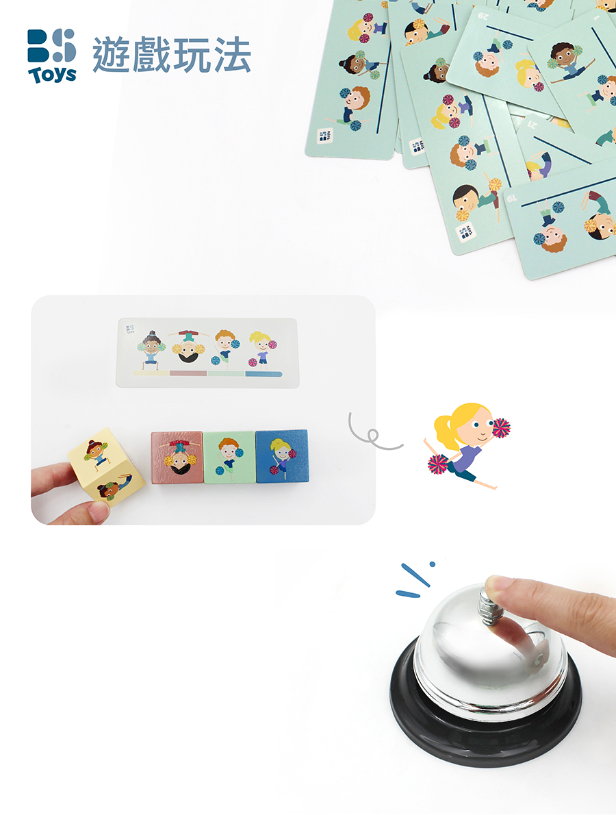 啦啦隊員們準備翻滾啦!試著最快速地按照卡片的圖案,將你的方塊轉到正確的位置和順序。完成後,記得趕快搶答按鈴,贏取卡片吧!