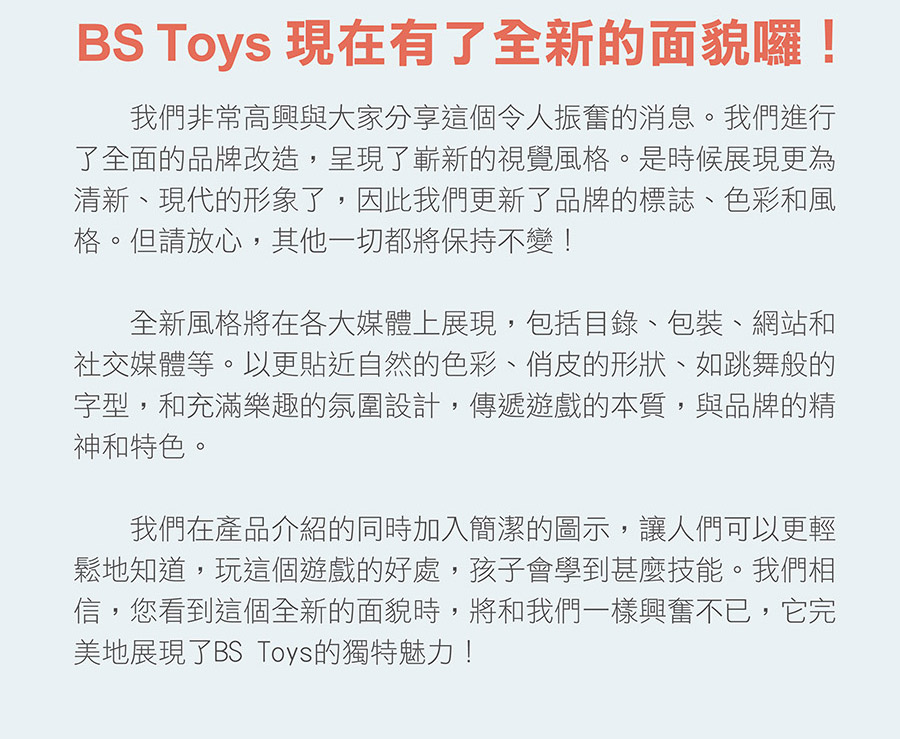 在BS Toys,我們正致力於玩具的改進和創意,因為我們希望為全球兒童的發展做出貢獻。 所有的開始都是來自對新產品的靈感,這些靈感來自生活各個地方。有時我們會設計出全新的玩具,或者重新設計商品。