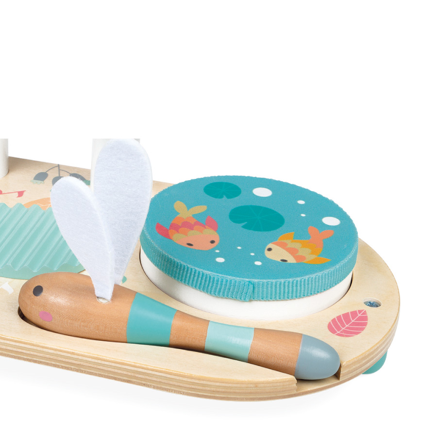 鼓面化身為美麗的小池塘,魚兒在睡蓮下吐著泡泡,充滿童趣想像