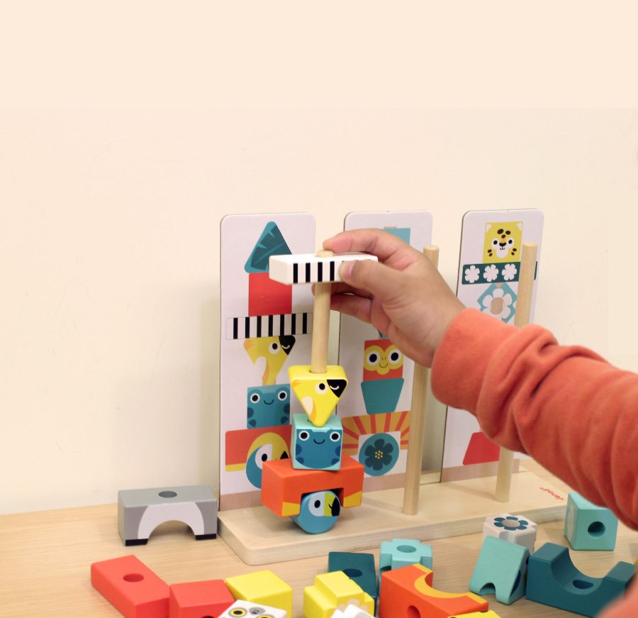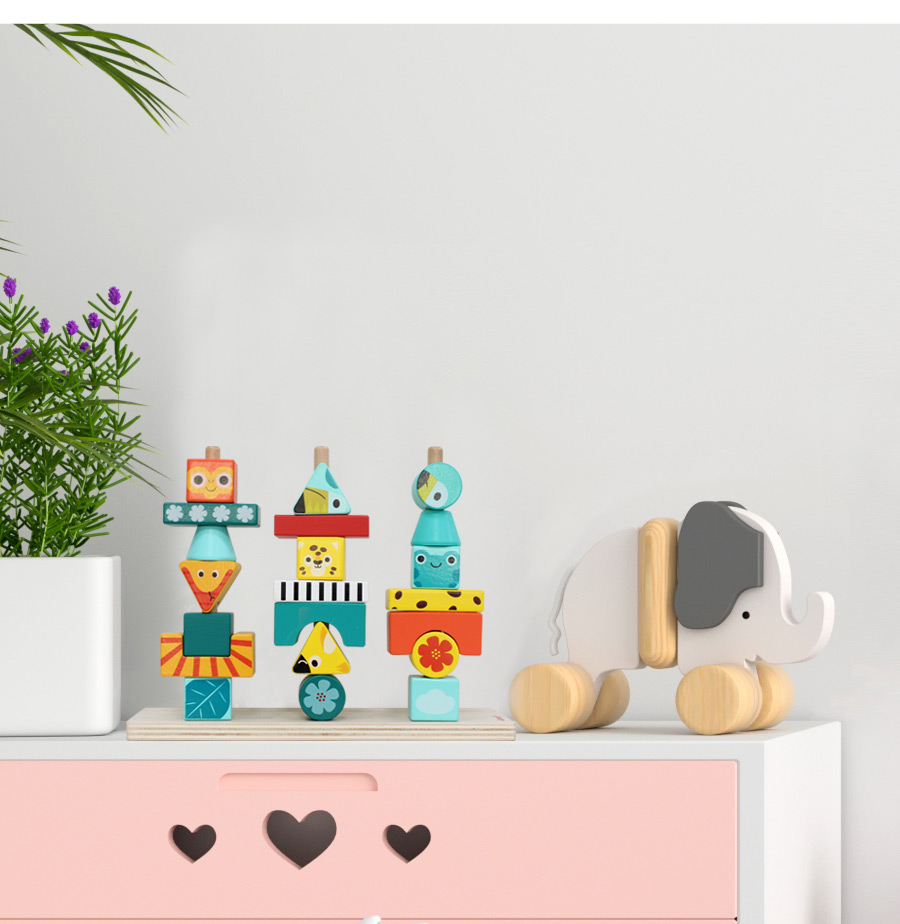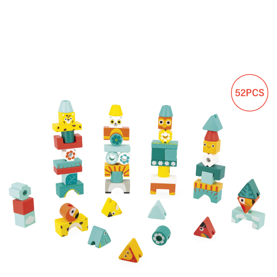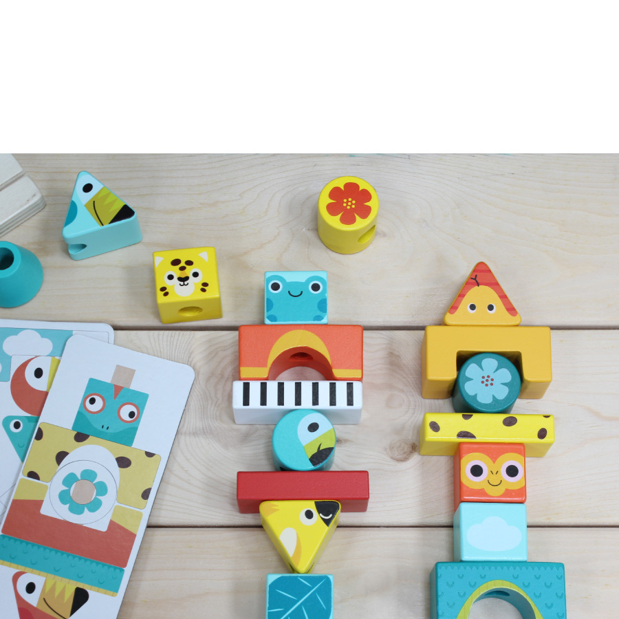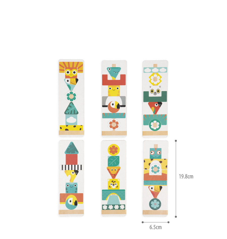 按照卡片上的美麗圖騰,將積木逐層堆疊在柱子上