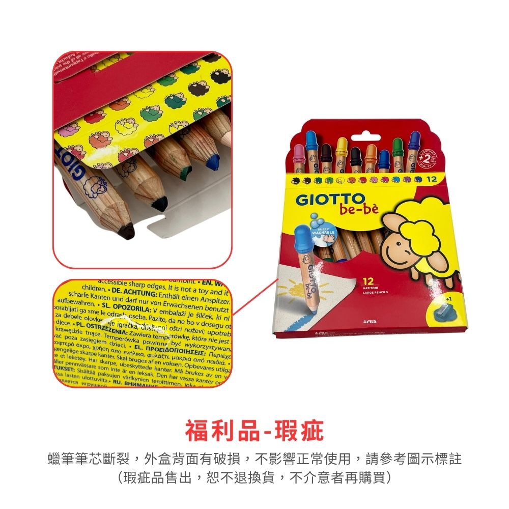 ● 福利品-瑕疵 : 蠟筆筆芯斷裂,外盒背面有破損,不影響正常使用,請參考圖示標註(瑕疵品售出,恕不退換貨,不介意者再購買)