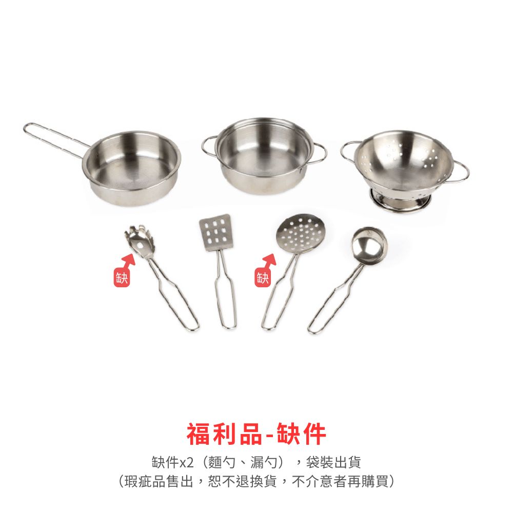 專為小小廚師準備的烹飪工具!湯鍋、濾鍋、麵勺、鍋鏟等各種廚具,擬真不鏽鋼器具材質,邊緣光滑不刮手,滿足孩子真實的體驗。