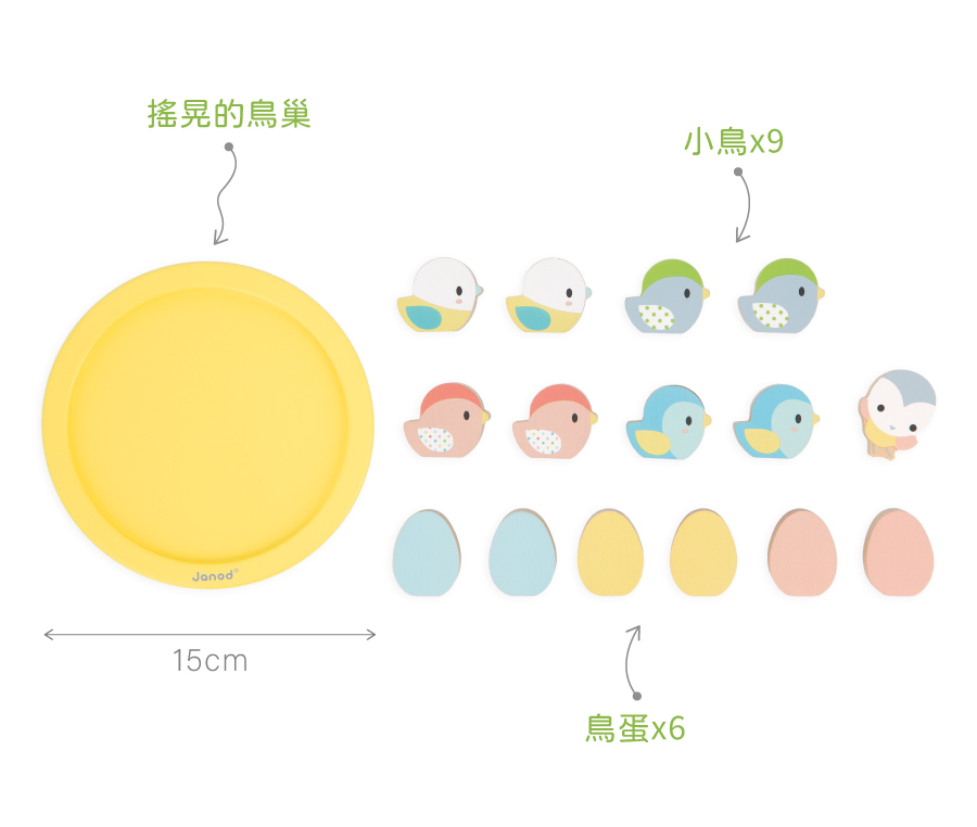 ● 內含一個搖晃的鳥巢、9隻鳥、6個鳥蛋
