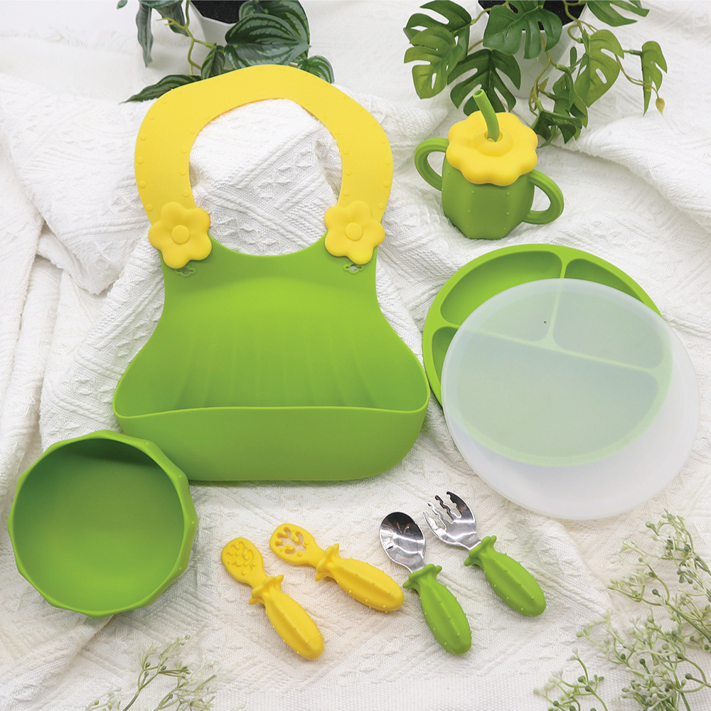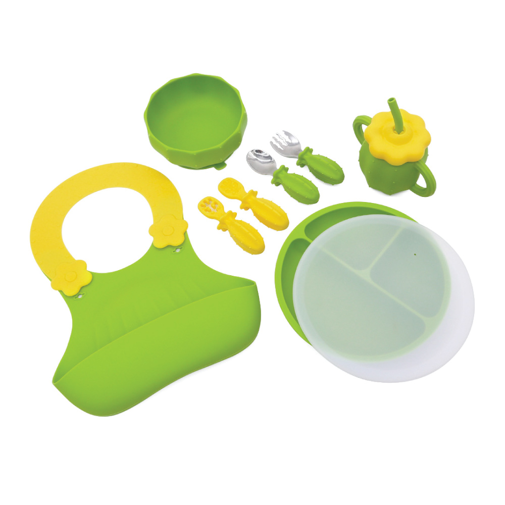 內含:矽膠圍兜、矽膠餐盤、矽膠餐碗、矽膠杯、矽膠訓練勺、不銹鋼勺叉