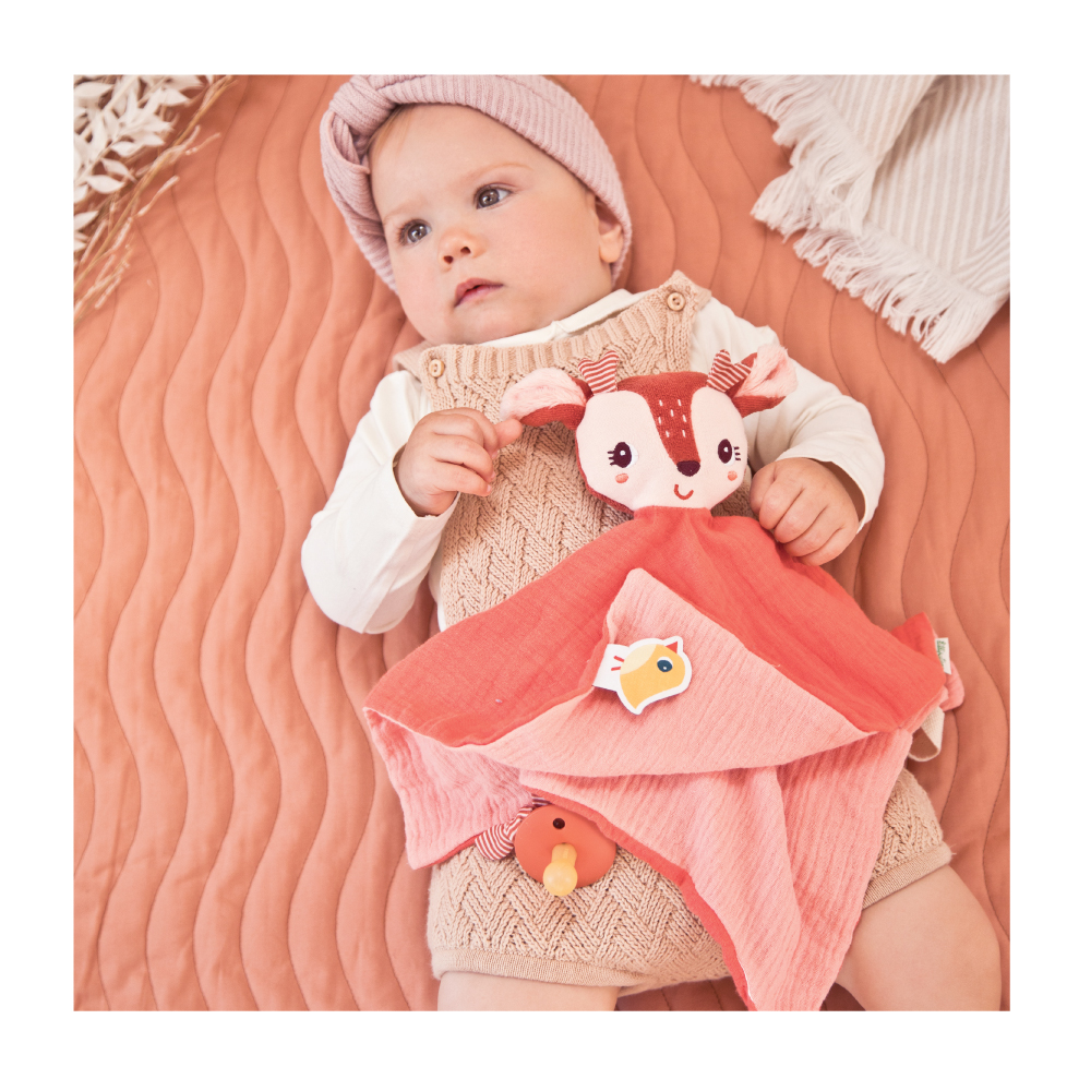 有機棉製成的安撫巾,一巾可多用,柔軟親膚,滿足寶寶安心感更好入睡,可愛的原創造型,一秒變身手偶,吸引寶寶注意,最棒的是能將奶嘴固定於安撫巾上,不會再為了找不到奶嘴而傷腦筋囉!