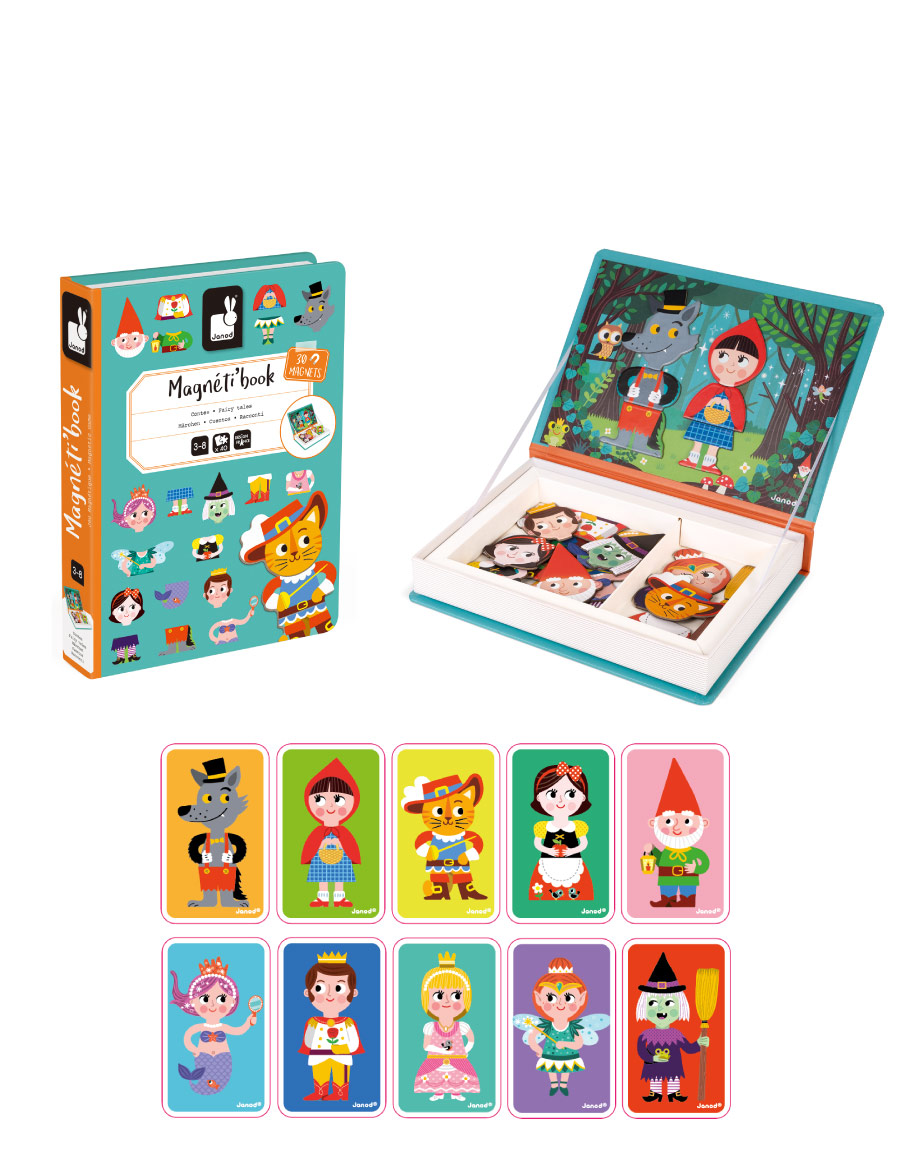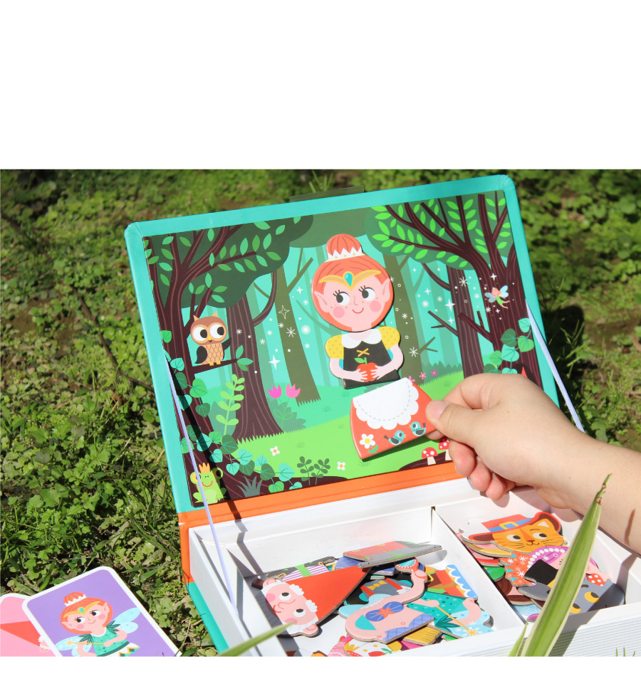 一個看似書本的堅固外盒,打開書本,將帶領孩子進入天馬行空的想像世界。法式插畫,結合多元的磁性元件,增加趣味性,內附指示圖卡,可引導小小孩基本認知對應的能力。穩定的磁性,可使遊戲進行更順暢,特別是外出時~