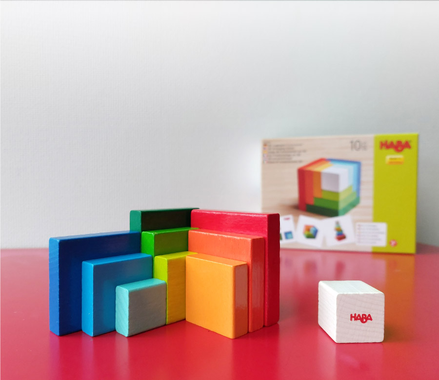 以正立方體為基礎,等比例切割出10塊大小不同的立方積木,彼此間存在著巧妙的互補及組合關係,讓孩子在拼湊和堆疊時產生許多驚喜。