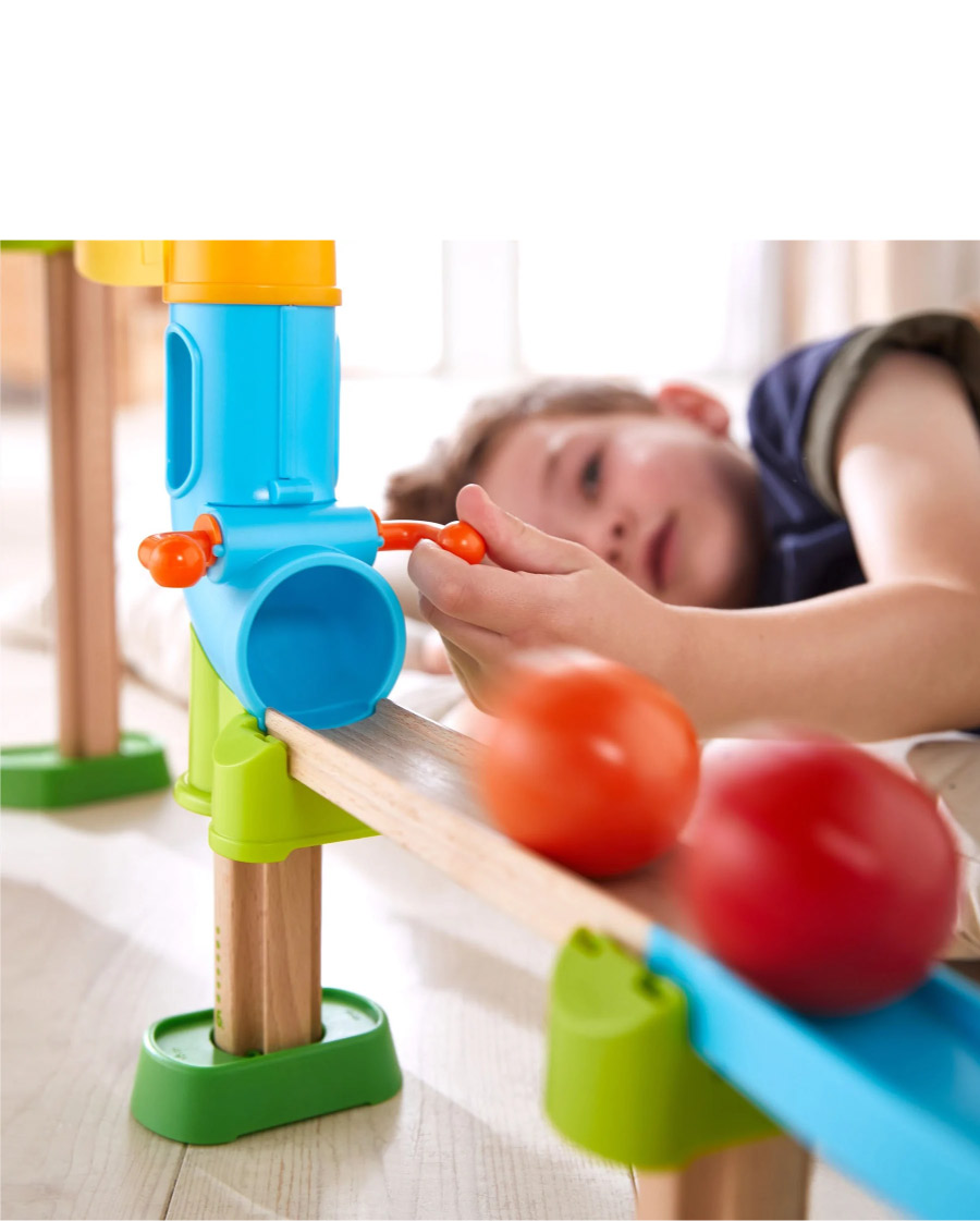 透過不同的坡道與支柱嘗試不同的速度和高度。他們可以一次又一次地規劃、構建、重新佈置,經由遊戲培養專注力、想像力、視覺空間技能與計數能力。