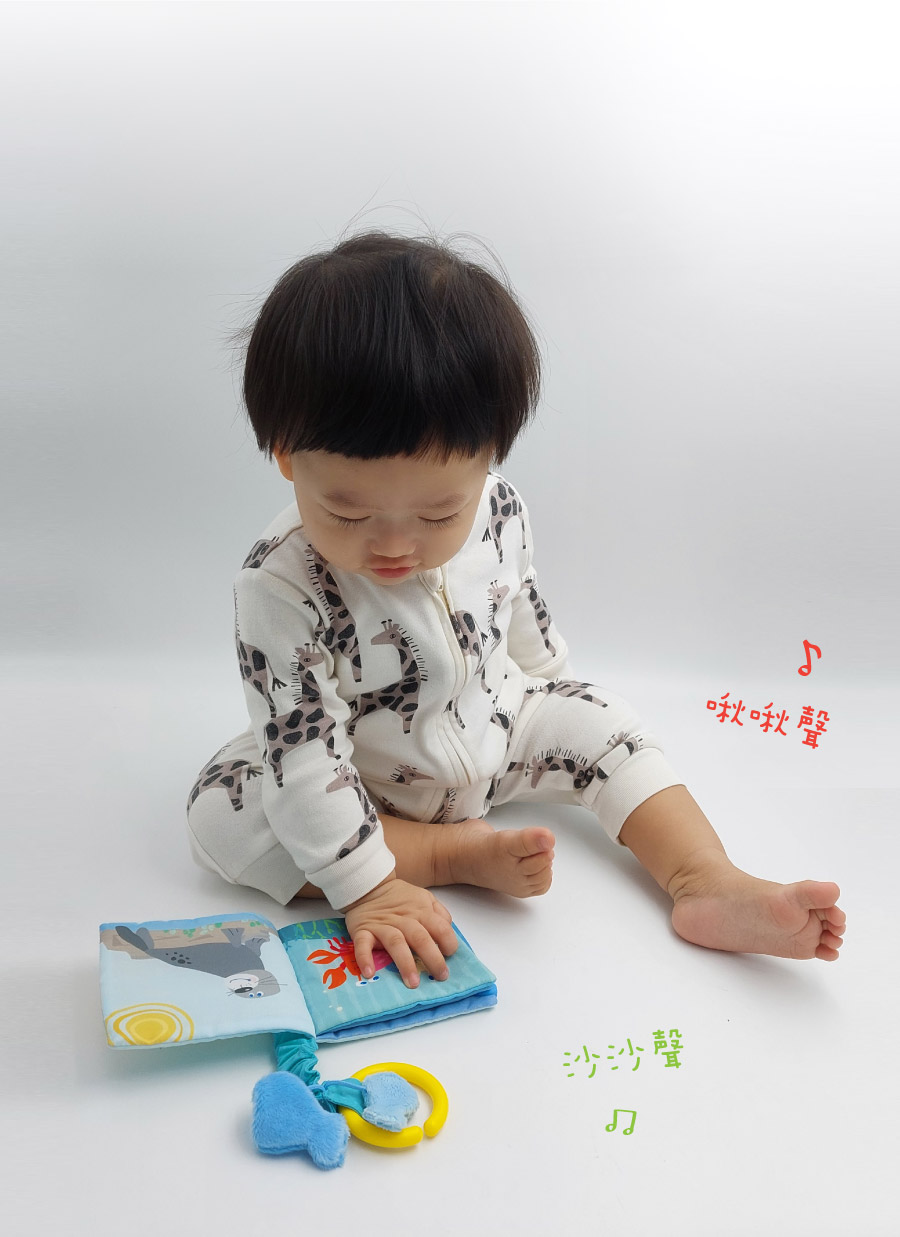 內頁隱藏響紙和發聲器,揉捏時會發出聲響,激發寶寶感知