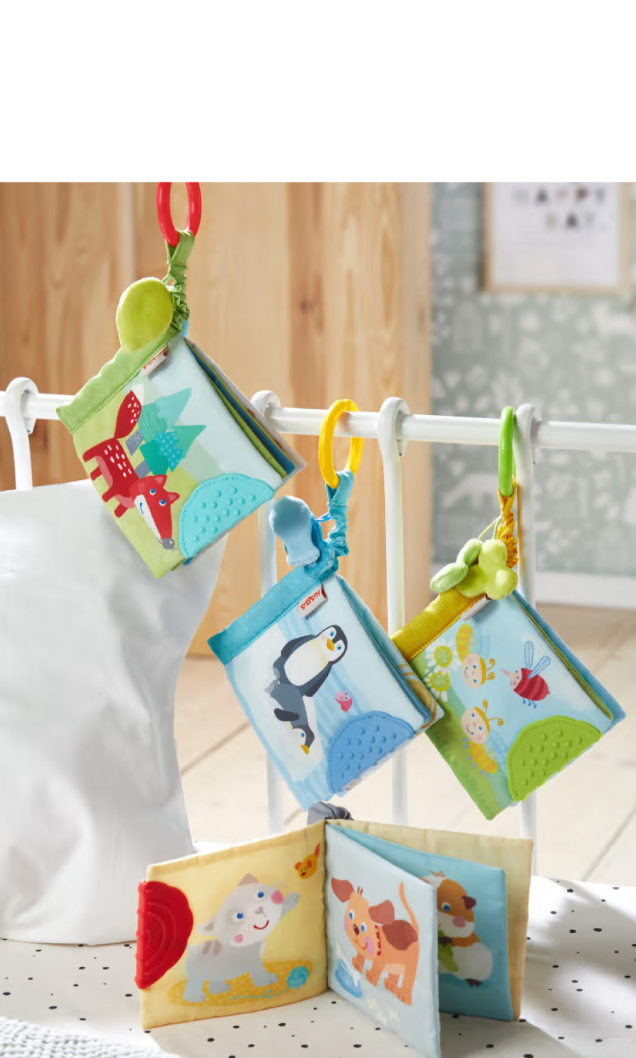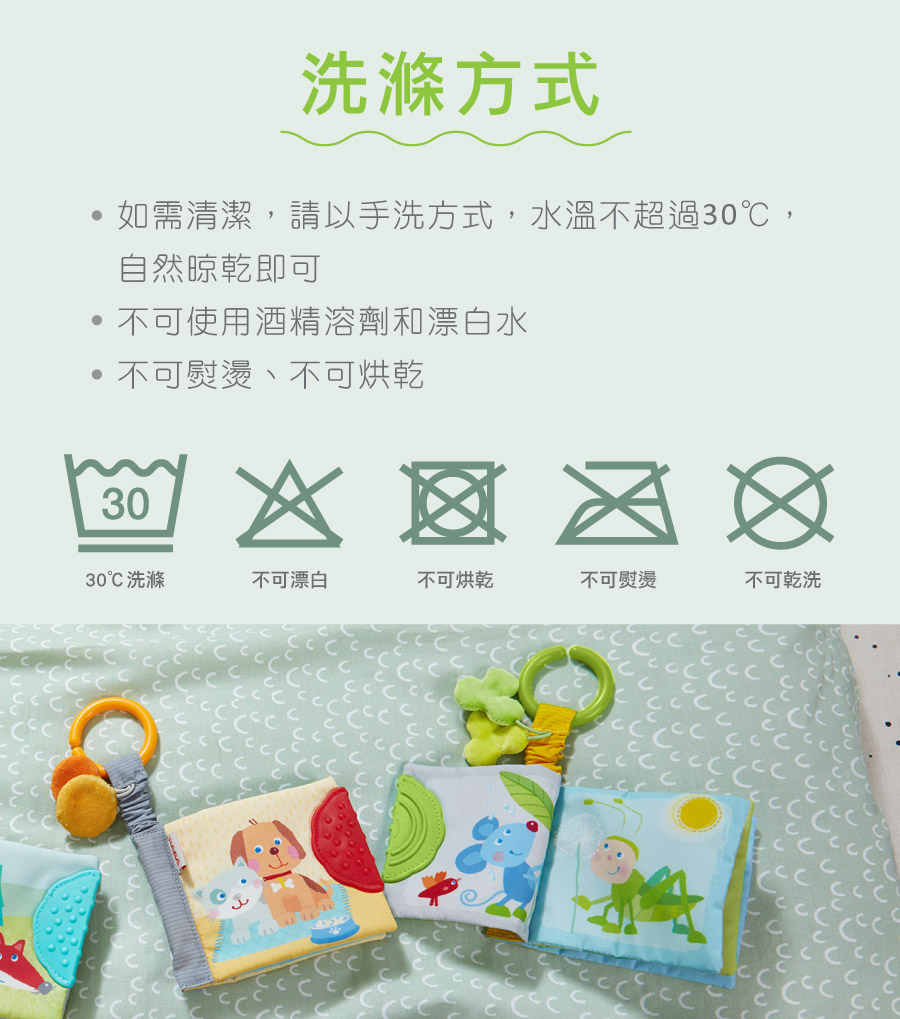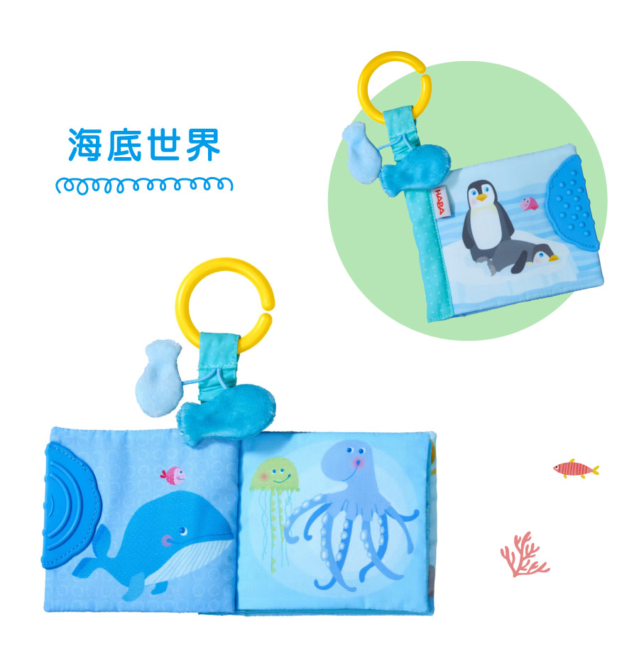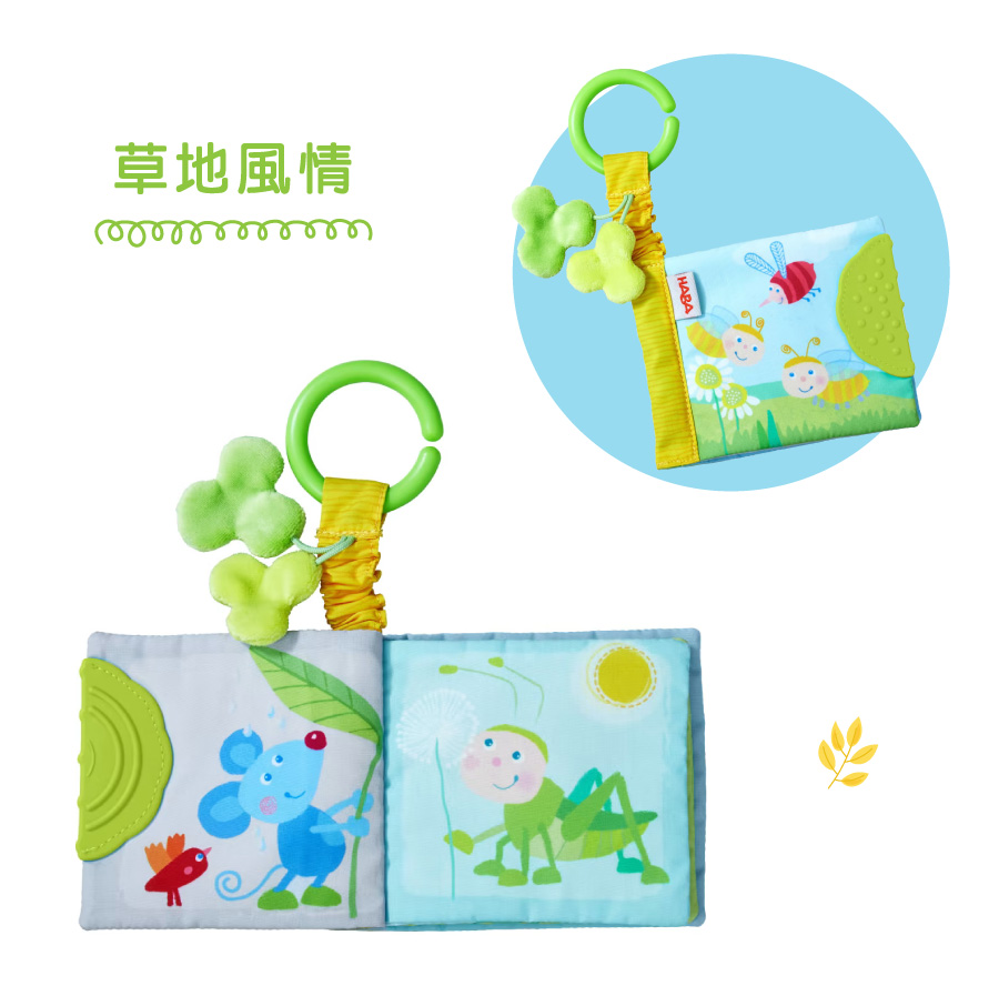 德國HABA隨意掛寶寶布書,多元設計,內頁隱藏響紙和發聲器,激發寶寶的感知;頁緣縫製無毒橡膠,非常適合按摩牙齦,並緩解出牙的不適;強壯的C型掛環,可隨意吊掛,是寶寶外出移動時的育兒好物。