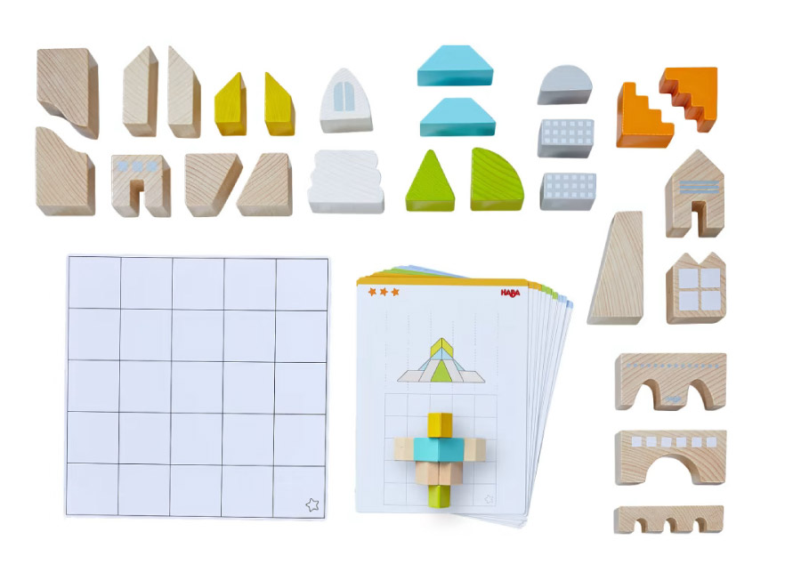 內附:積木x26、方位模板x1、雙面圖形題卡x16(三種難度級別)
