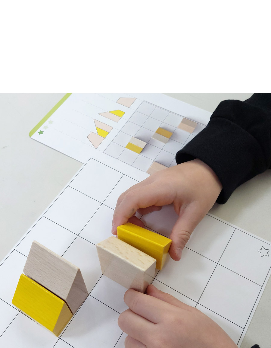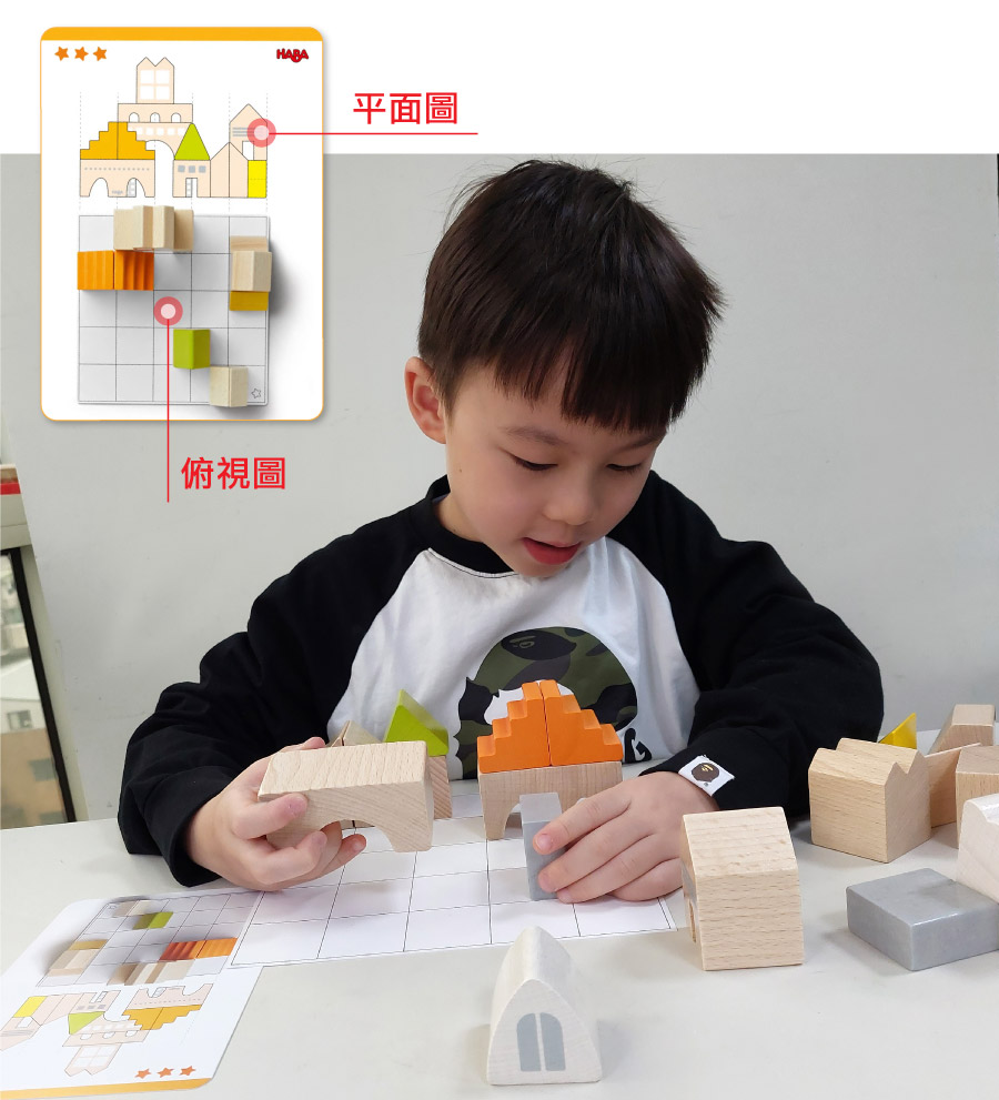 選擇一張題卡,觀察題卡中的平面圖與俯視圖,發揮空間想像力,將積木正確排列到模板上