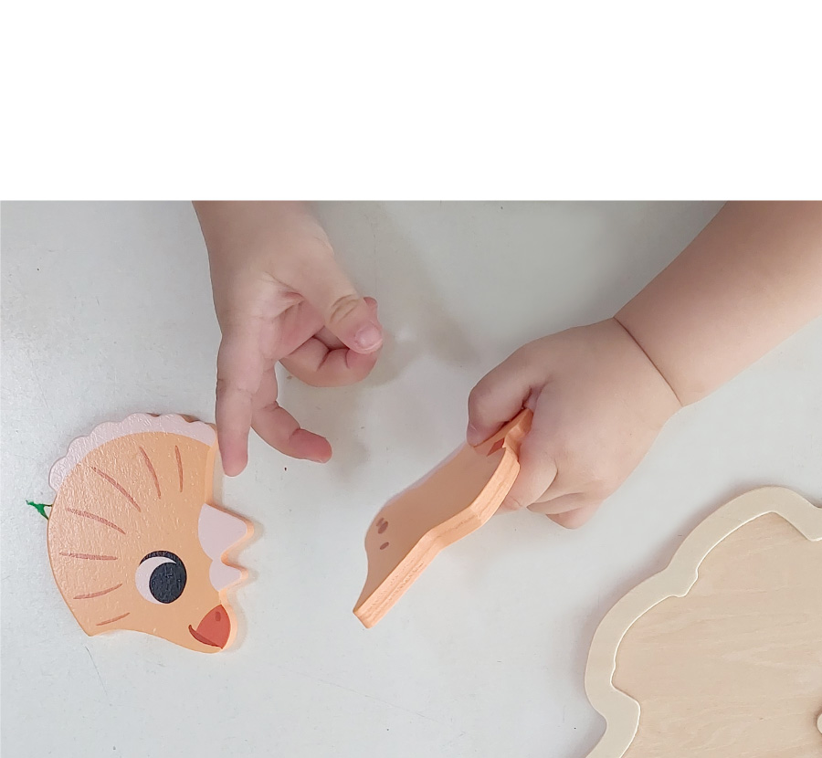 4隻小恐龍,各由不同片數組成,漸進式拼圖,附底坂,讓寶寶第一次拼圖就上手。