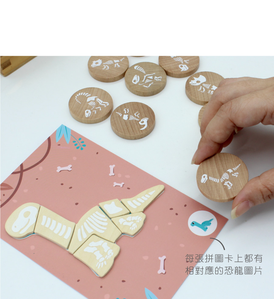 -  內附:木製骨骼碎片x64、恐龍骨骼標記x10、拼圖卡x10、放大鏡x1、刷子x1、沙袋x1