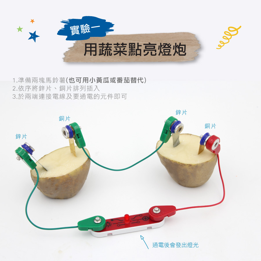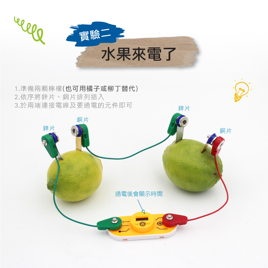 電是由帶電粒子產生,是肉眼無法看見。帶電粒子分正電與負電。同性相斥,異性相吸。 電極包含一正一負,金色銅片為正電,稱陽極 (Anodes)。銀色鋅片為負電,稱陰極(cathodes)。水果、蔬菜、液體通常也包含帶電粒子,這樣的物質富含電解質,當電解質透過正負極連結起來,就會產生化學反應。帶電粒子的流動就會造成電流,使得電子裝置得以運作,電線則負責傳導電離子。