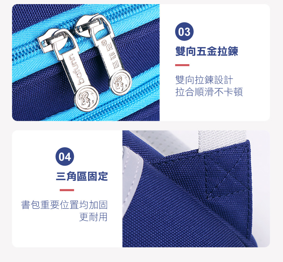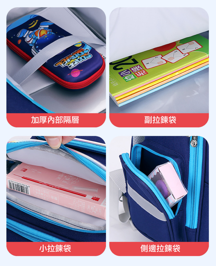 ● 4點式承托,人體工學重力分區穩固書包,保護孩子腰部和脊椎,保持挺拔身形