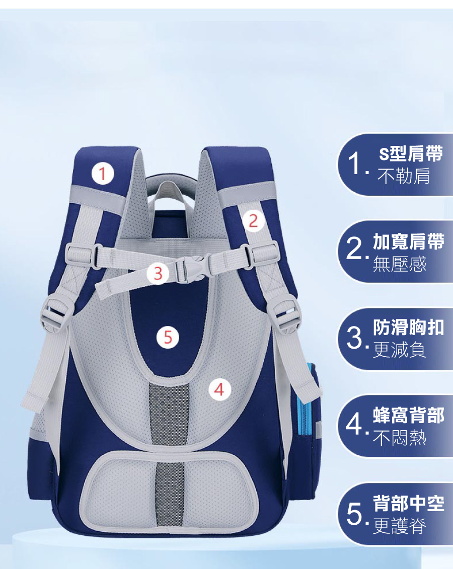 ● 3D護脊背幅,均勻分散書包重量,加厚海綿精準定位背部三大部分,背起來更輕鬆