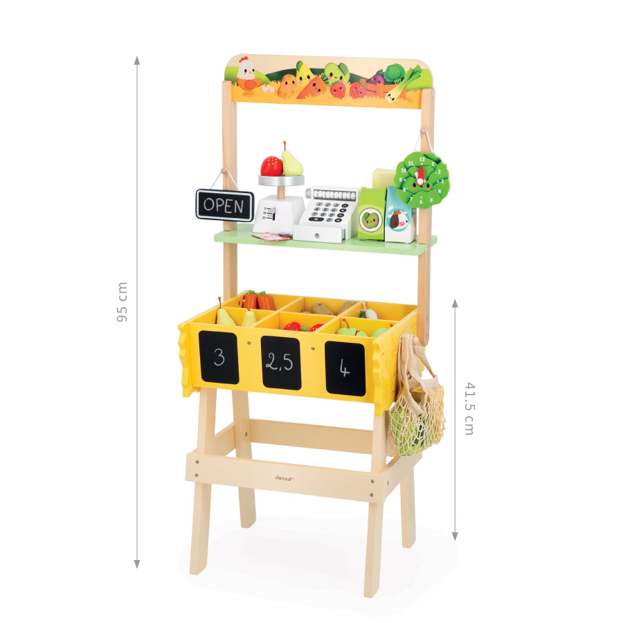 -  內附:時鐘、收銀機、磅秤、黑板、粉筆x1盒、玩具紙鈔硬幣x1套、盒裝食品x5、網狀購物袋x2、牛皮紙袋x5、蔬果(蘋果x3、梨子x3、草莓x3、胡蘿蔔x3、韭菜x3、馬鈴薯x3)