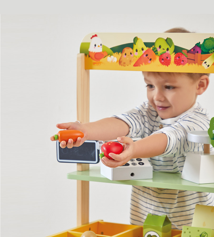 農夫市集開張囉!讓孩子透過當老闆或客人的角色,享受收銀員或購物的樂趣。從中學習社會能力、增進語言發展,是孩子樂此不疲的遊戲。