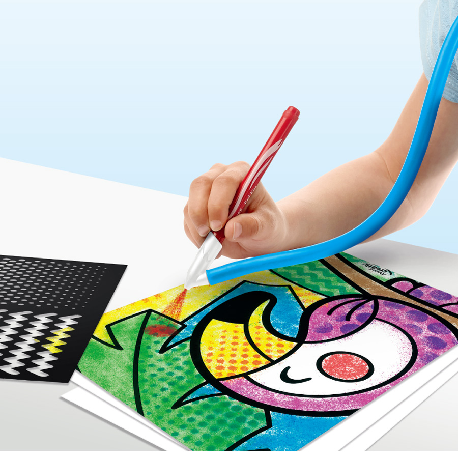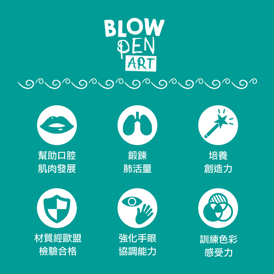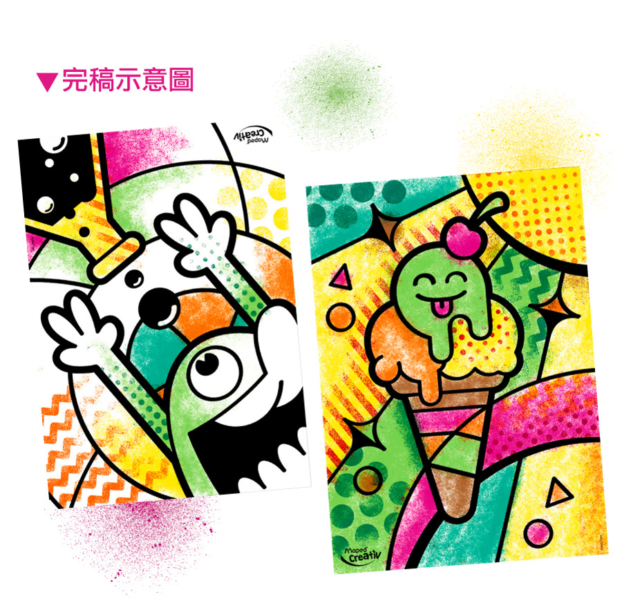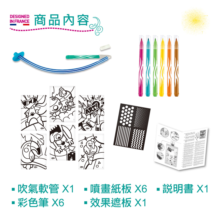 內附 : 吹氣軟管 X1、彩色筆 X6、噴畫紙板 X6、效果遮板 X1、說明書 X1