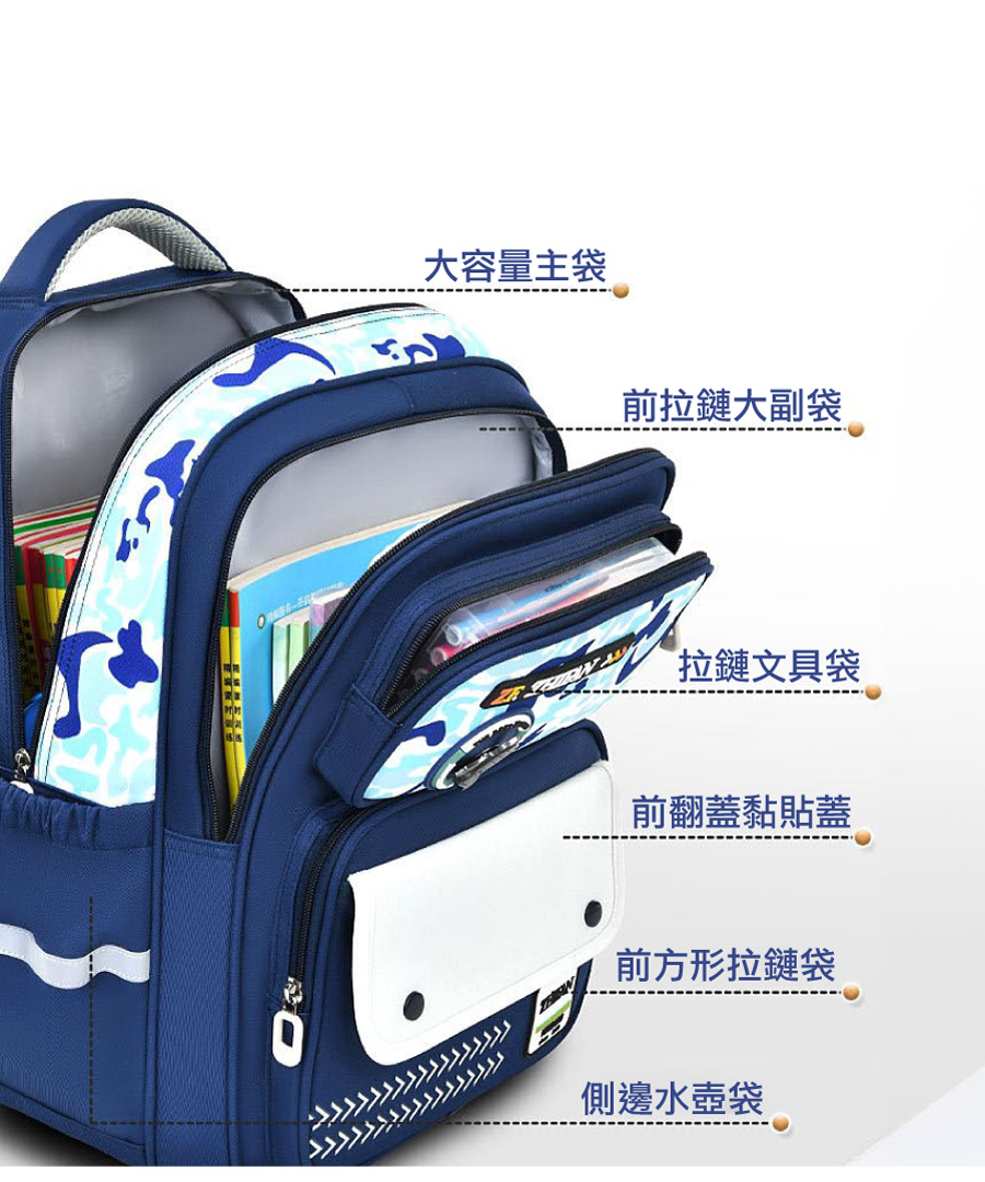 ● 5點式承托,人體工學重力分區穩固書包,保護孩子腰部和脊椎,保持挺拔身形