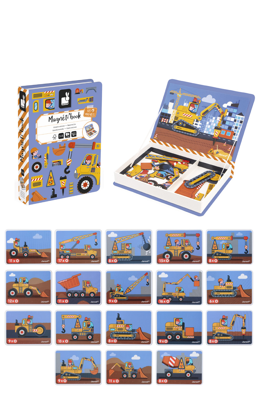 一個看似書本的堅固外盒,打開書本,將帶領孩子進入天馬行空的想像世界。法式插畫,結合多元的磁性元件,增加趣味性,內附指示圖卡,可引導小小孩基本認知對應的能力。穩定的磁性,可使遊戲進行更順暢,特別是外出時~