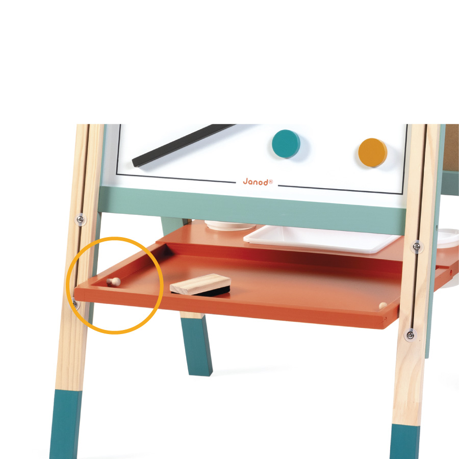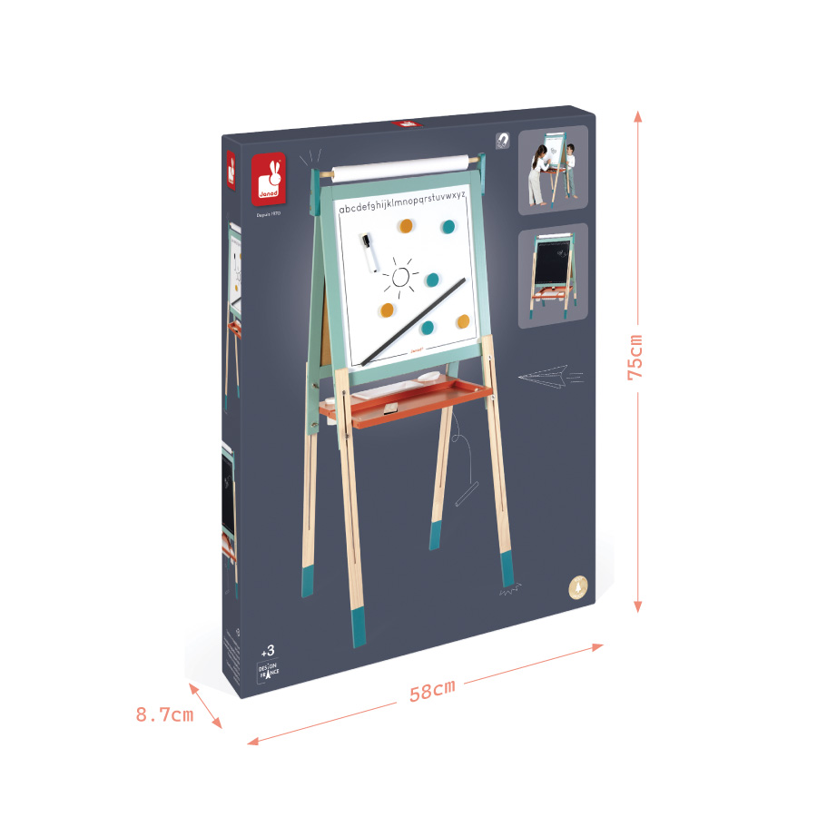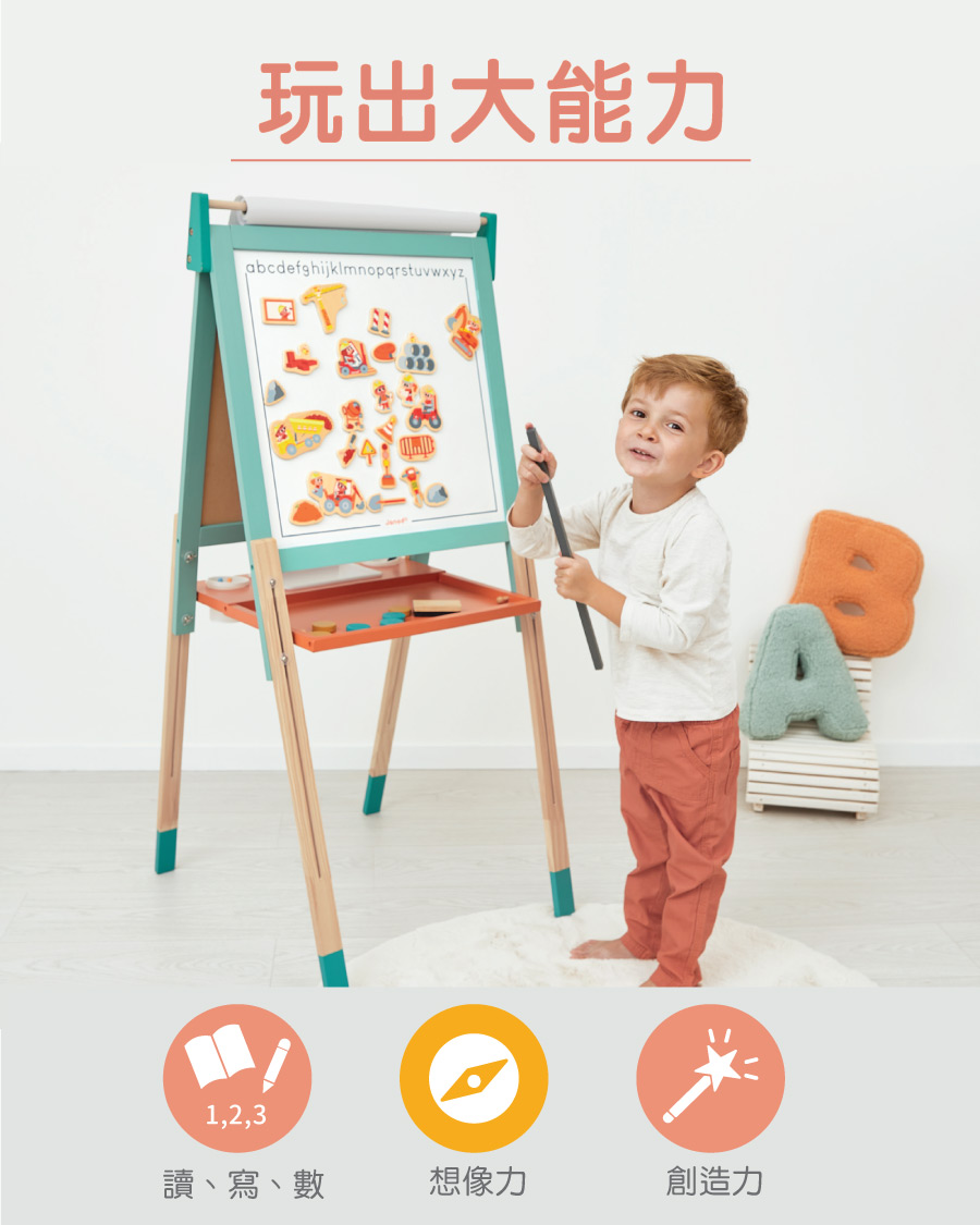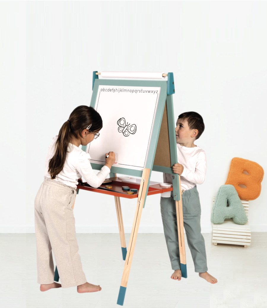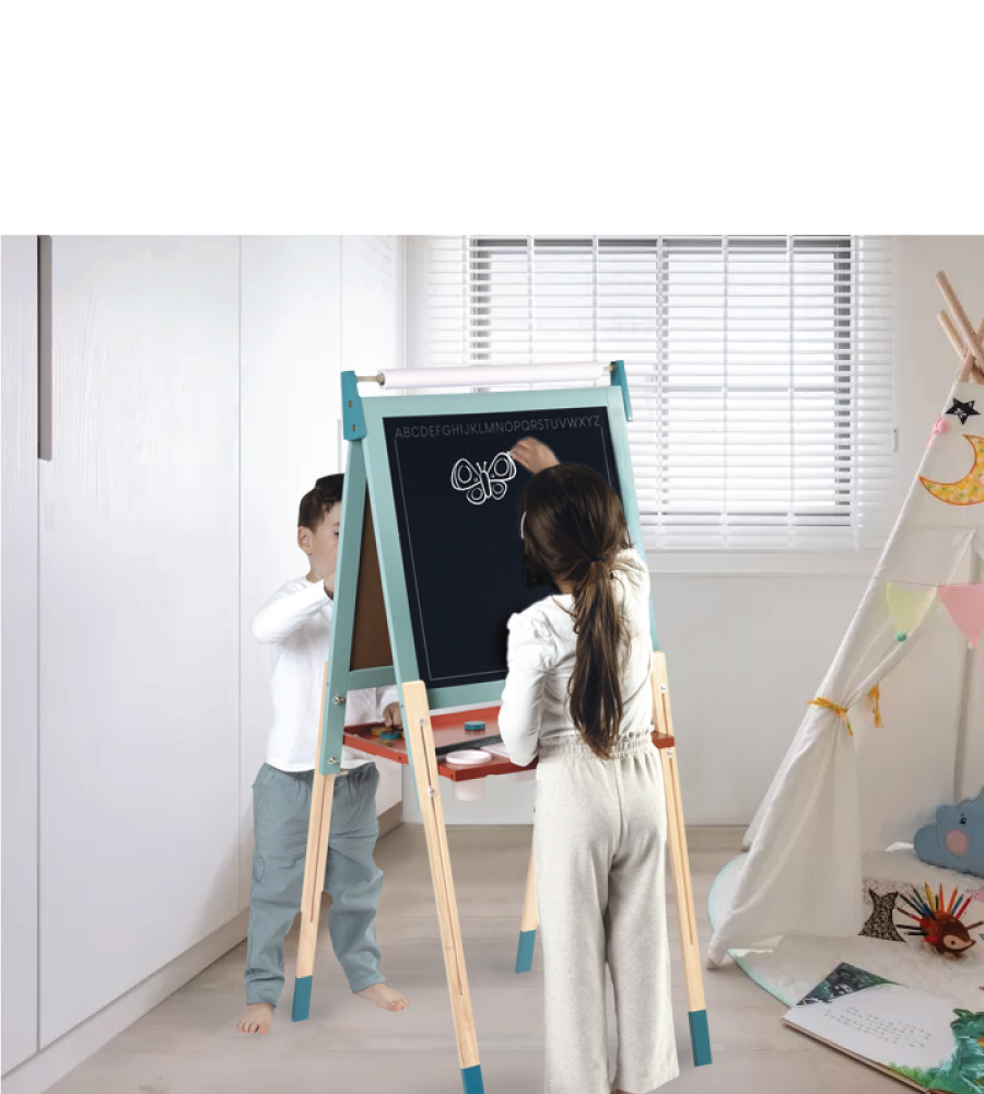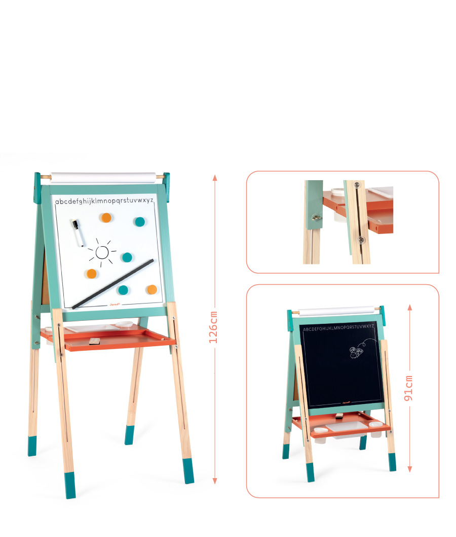 雙面立式畫架,可依身高調整高度,搭配捲軸式畫紙,並融入南法鄉村色調,讓畫架也能成為家中一個美麗的角落。