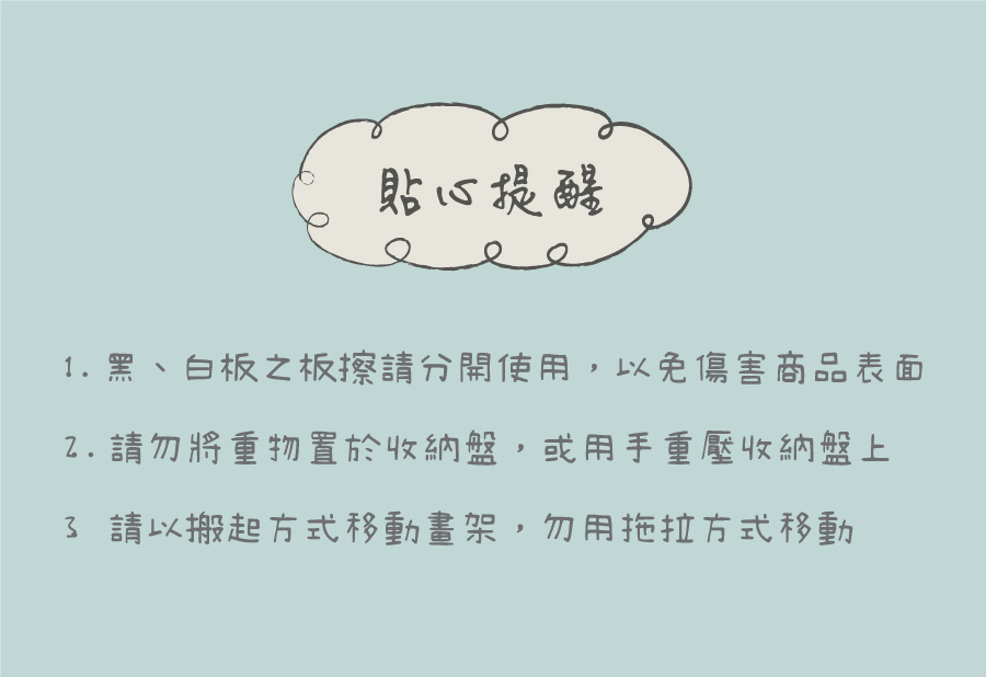 內附13樣配件:紙捲x1、板擦x1、10入粉筆x1、白板筆x1、洗筆杯x2、磁鐵片x6、磁條x1、 置物盒x1