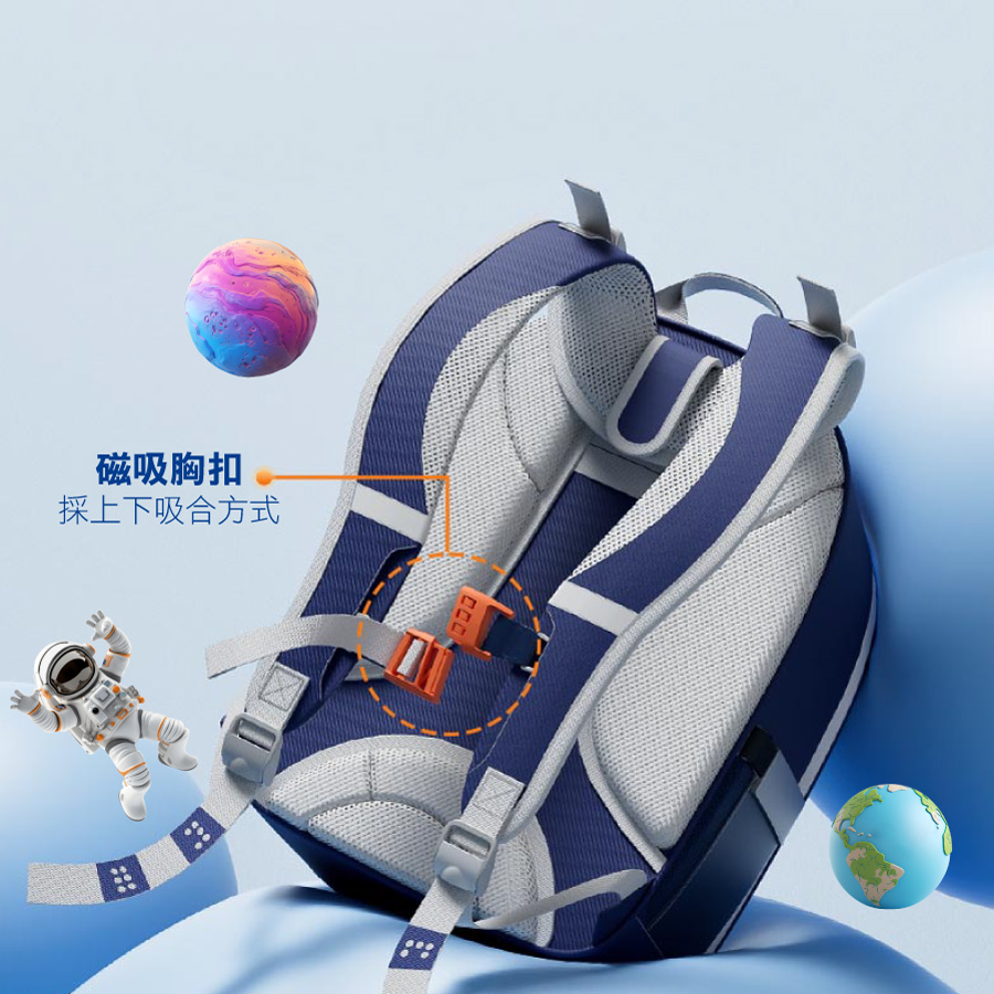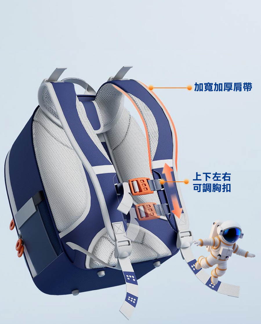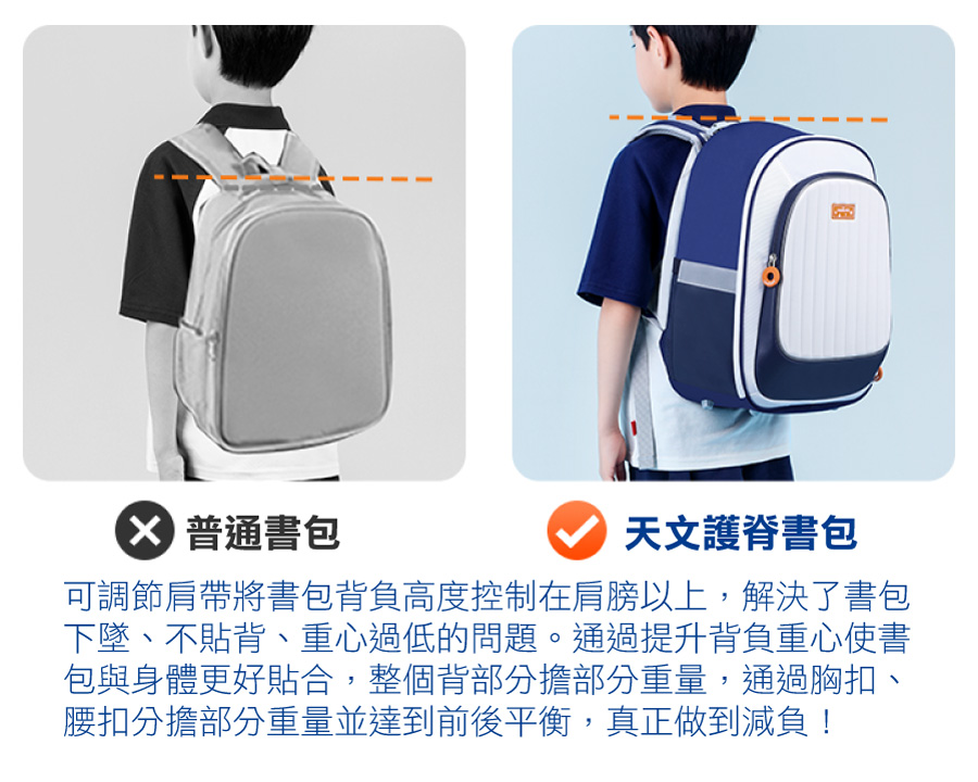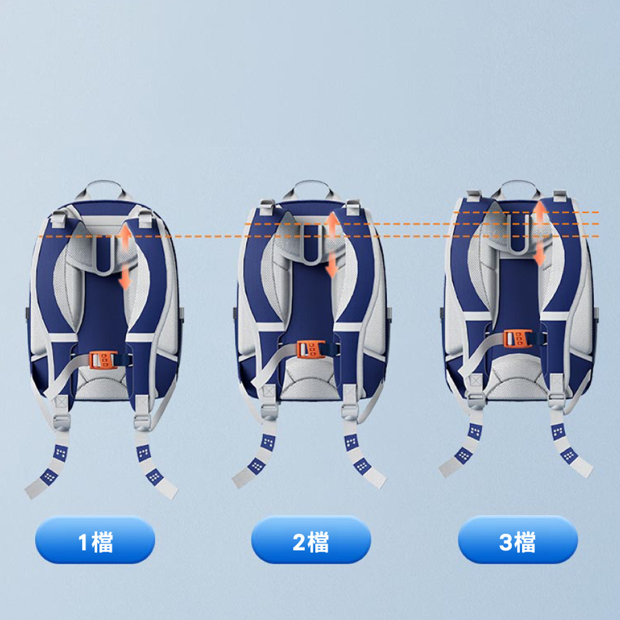 肩帶高度可依據孩子身高調節,始終讓書包底部高於孩子腰部,提高重心分散壓力