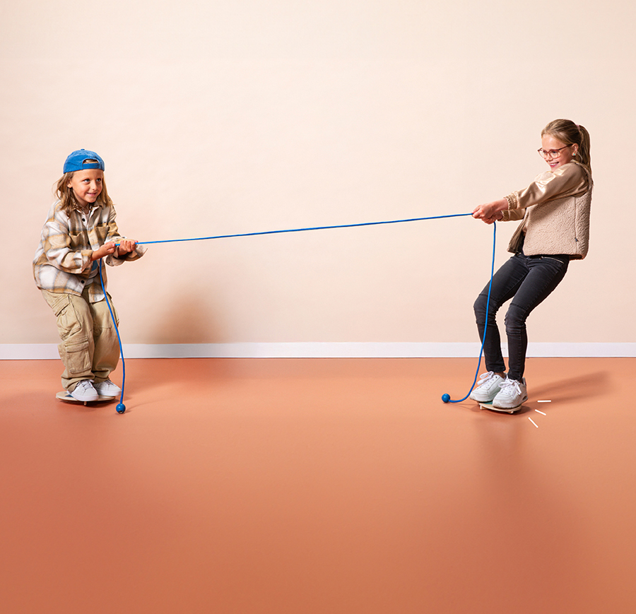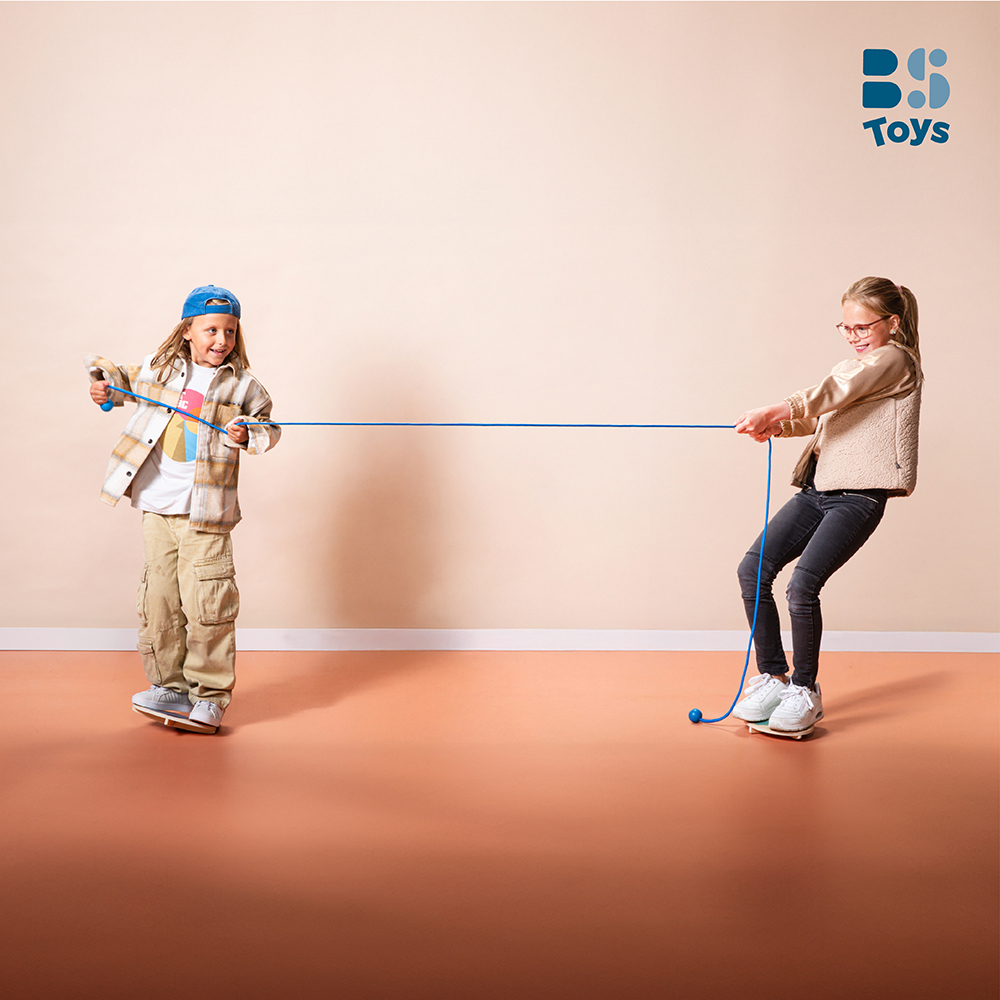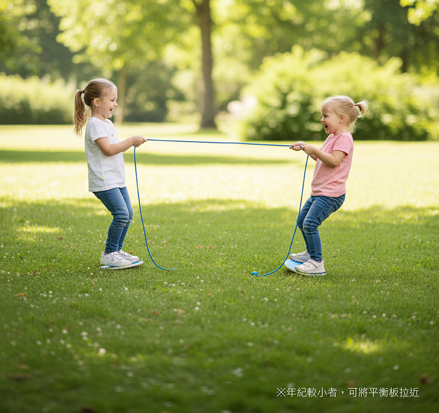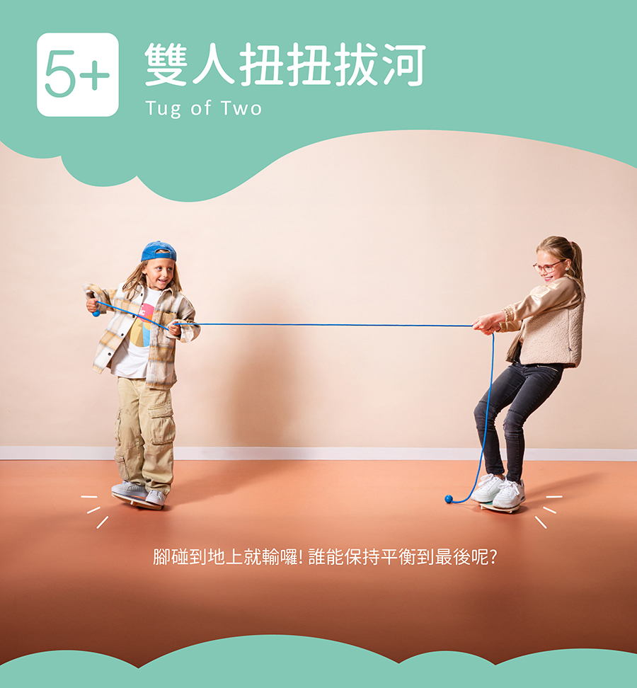 站上你的平衡板,握緊繩子。現在試著把對手拉下來,但自己不能跌倒!誰能站穩雙腳不落地、誰會先掉下去呢?