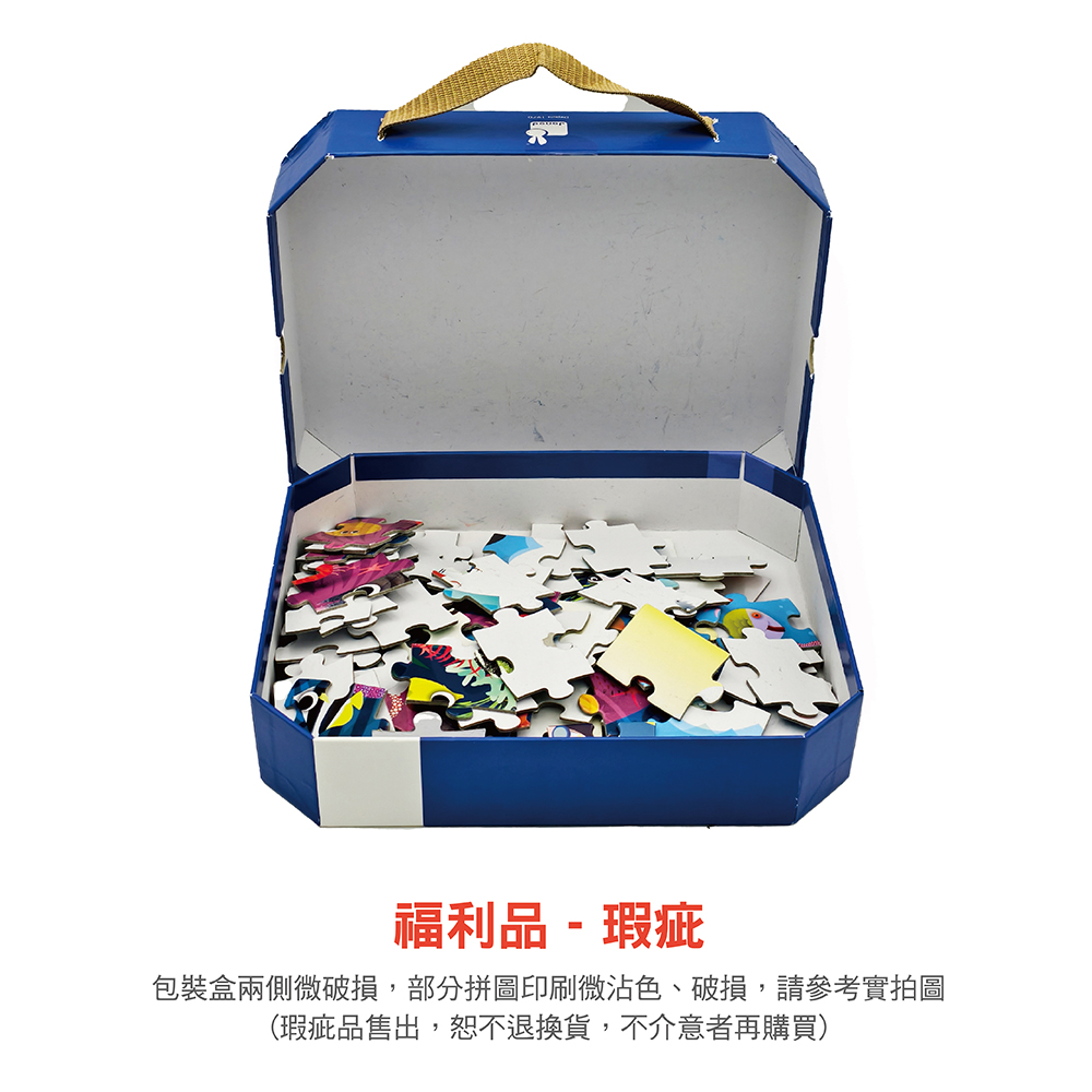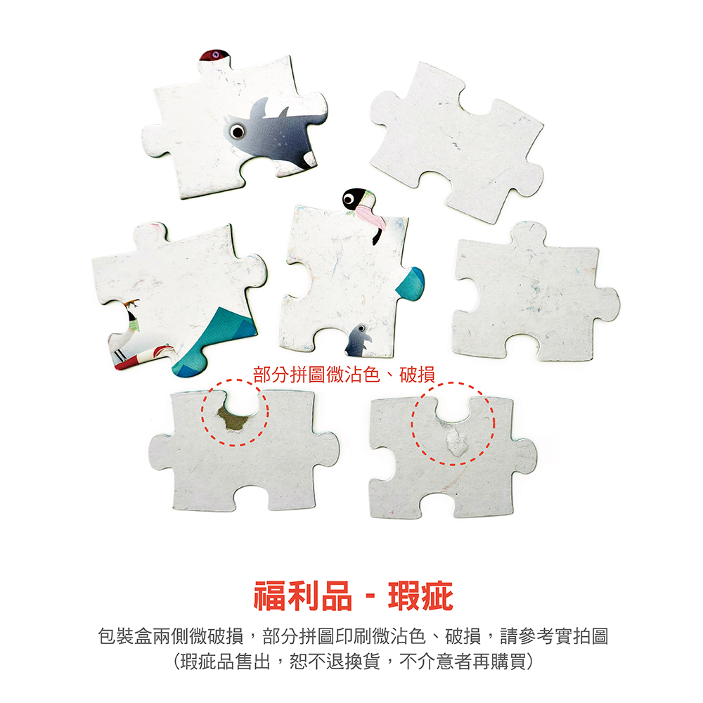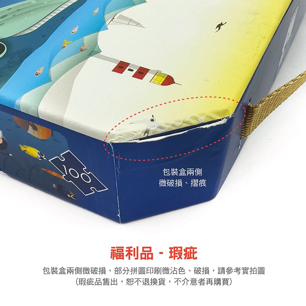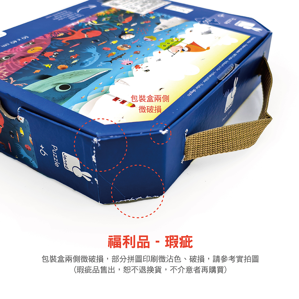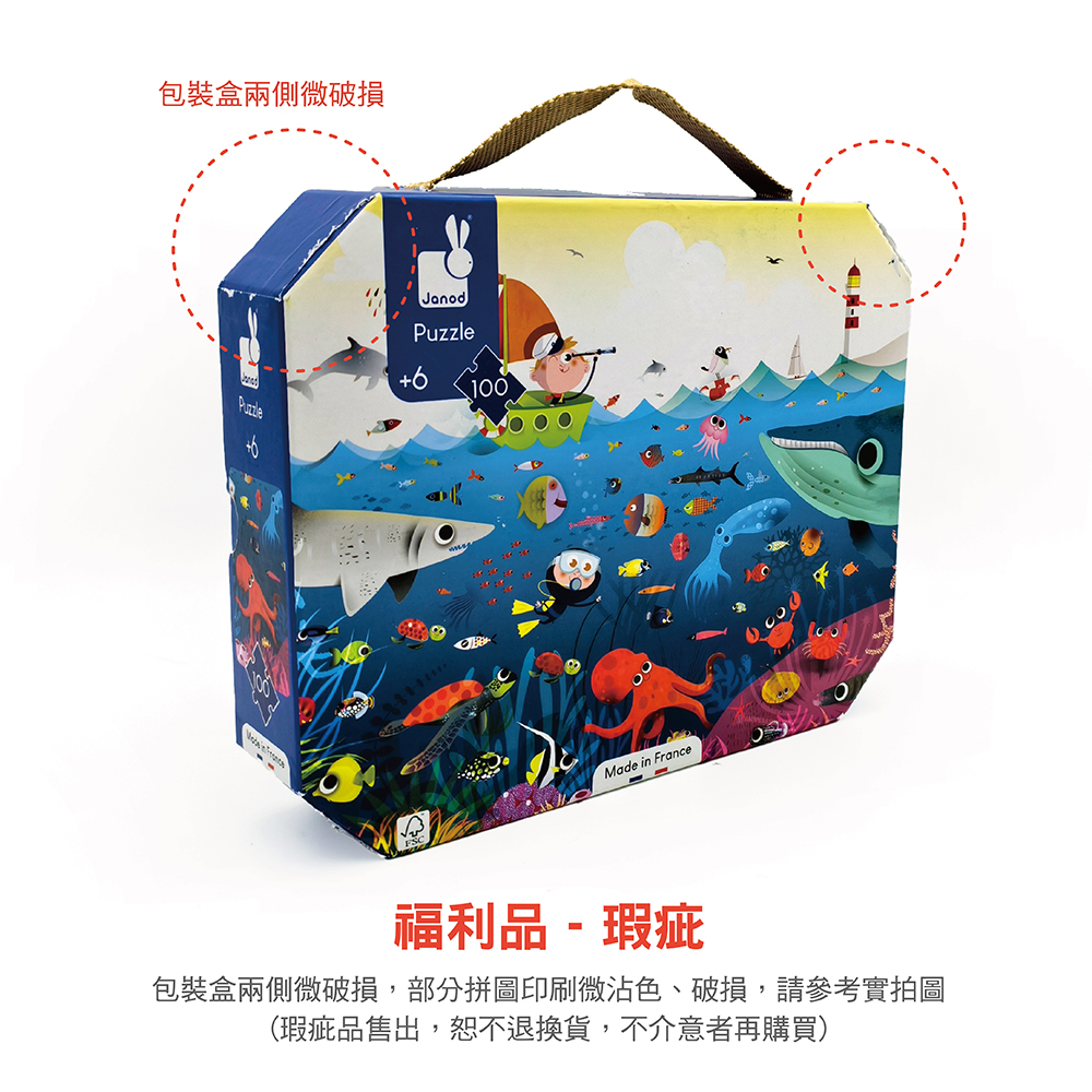 好多五顏六色的熱帶魚喔!海龜、螃蟹、章魚,還有美麗的海葵和珊瑚,哇~好大的座頭鯨,牠應該是海洋裡最大的生物了。 鯊魚來了~大家快逃啊! ● 精美硬質手提盒,方便收納攜帶 。 ● 採用植物油墨印製,所有材質均可回收,法國製造 ● 內附原圖海報引導孩子完成拼圖 ● 福利品-瑕疵 :包裝盒兩側微破損,部分拼圖印刷微沾色、破損,請參考實拍圖 (瑕疵品售出,恕不退換貨,不介意者再購買)