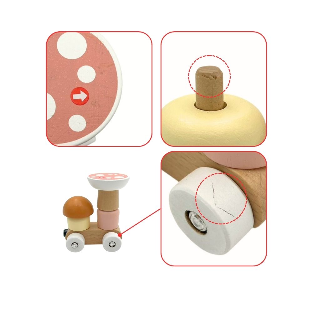 跟著小蝸牛去散步吧~ 隊伍最前面的蝸牛的殼是個撥浪鼓!寶寶可以搖晃它,使其發出聲音,並透過仔細觀察裡面的彩珠來刺激他的聽覺和視覺。有趣的是,撥浪鼓放在蝸牛背上,它會隨著火車的移動而自行滾動喔…