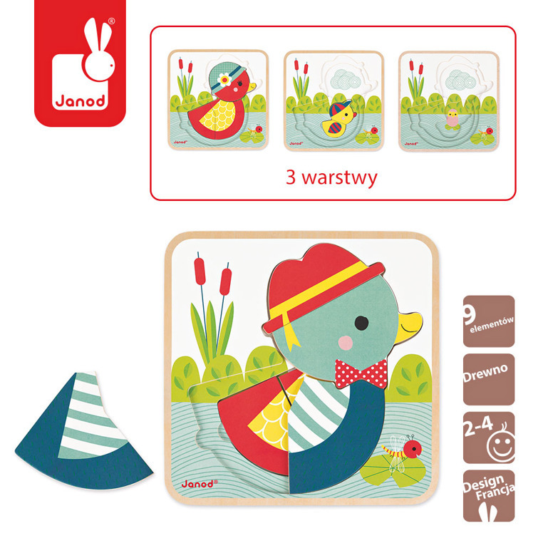 它包含三個拼圖:第一層是小鴨子(2塊),第二層是鴨媽媽(3塊),第三層是鴨爸爸(4塊)。這款拼圖非常適合幫助孩子發展精細動作技能和觀察能力。拼圖塊數:2塊、3塊和4塊。
