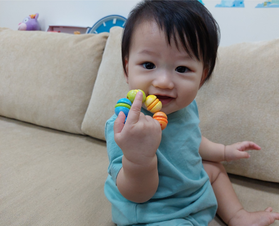 隨著寶寶長大,大約在3-4個月的時候,神經系統逐漸發育成熟,屈肌力量會逐漸減弱,伸肌力量逐漸增強,當兩者漸漸達到平衡狀態時,寶寶的小手就開始有抓取的動作,此時就可以給一些適合小手抓握的小玩具,最好是會發出聲響的,可以引發寶寶的好奇心及注意,讓寶寶更有興趣。